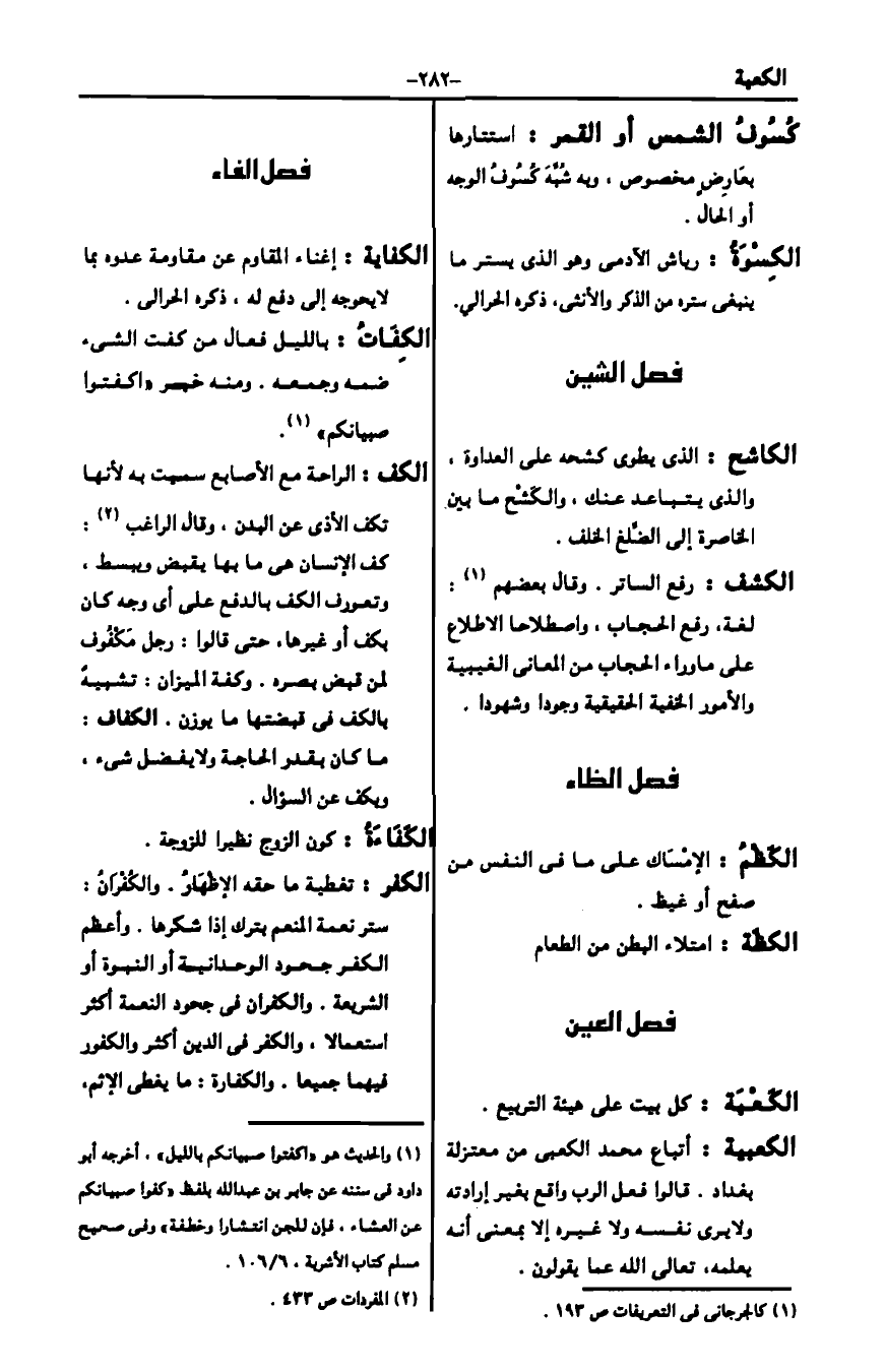الكف: الراحة مع الأصابع سميت به لأنها تكف الأذى عن البدن، وقال الراغب2: كف الإنسان هي ما بها يقبض ويبسط، وتعورف الكف بالدفع على أي وجه كان بكف أو غيرها، حتى قالوا: رجل مكفوف لمن قبض بصره. وكفه الميزان: تشبيه بالكف في قبضتها ما يوزن. الكفاف: ما كان بقدر الحاجة ولا يفضل شيء، ويكف عن السؤال.