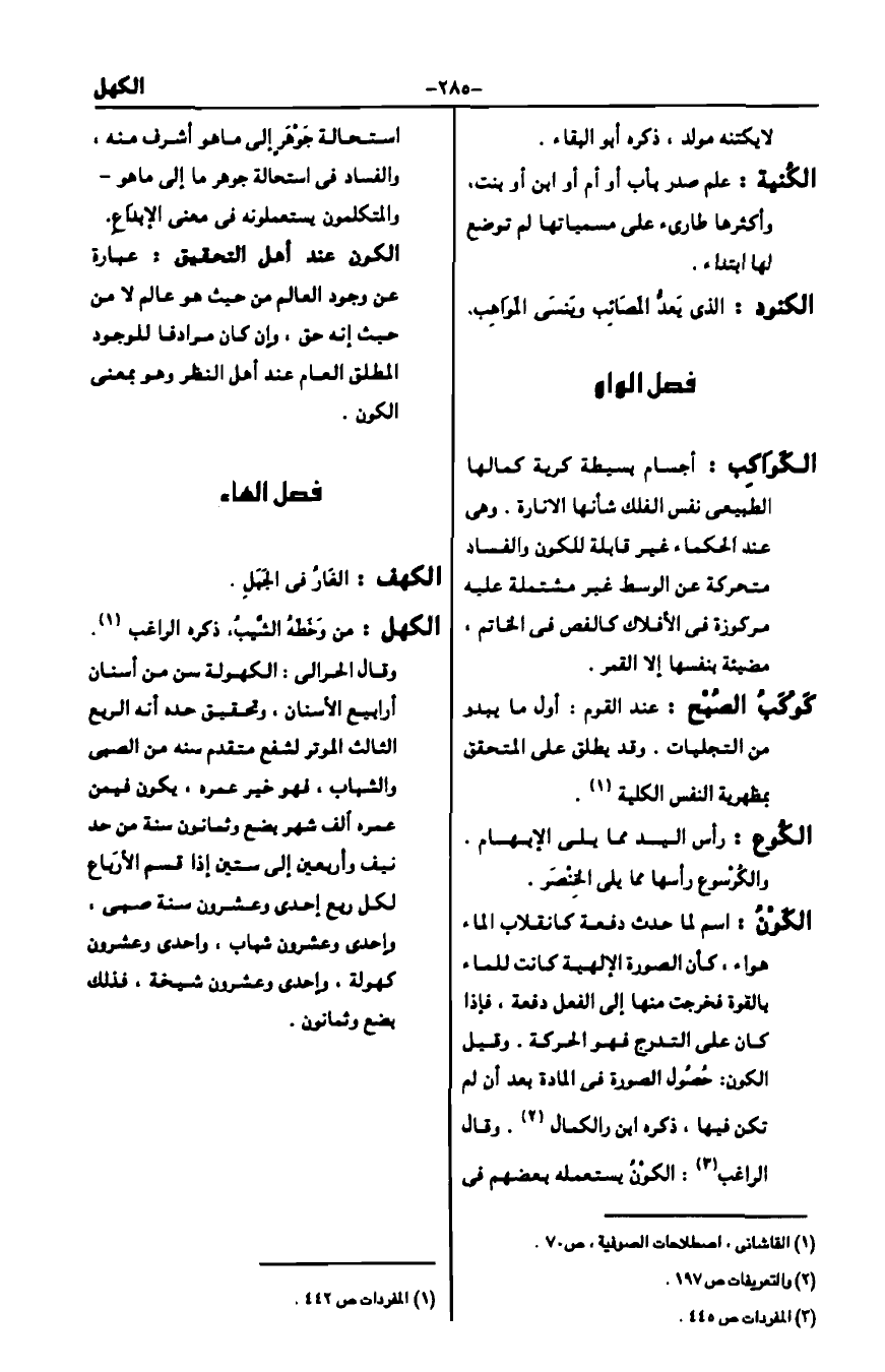 الكون: اسم لما حدث دفعة كانقلاب الماء هواء، كأن الصورة الإلهية كانت للماء بالقوة فخرجت منها إلى الفعل دفعة. فإذا كان على التدرج فهو الحركة. وقيل الكون حصول الصورة في المادة بعد أن لم تكون فيها، ذكره ابن الكمال2. وقال الراغب3: الكون يستعمله بعضهم في استحالة جوهر إلى ما هو أشرف منه، والفساد في استحالة جوهر ما إلى ما هو والمتكلمون يستعملونه في معنى الإبداع.