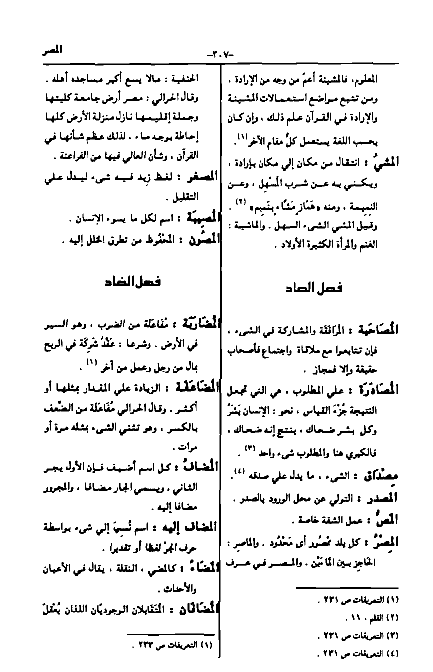 المصر: كل بلد ممصور أي محدود. والماصر: الحاجز بين الماءين. والمصر في عرف الحنفية: ما لا يسع أكبر مساجده أهله. وقال الحرالي: مصر أرض جامعة كليتها وجملة إقليمها نازل منزلة الأرض كلها فلها إحاطة بوجه ماء، فلذلك أعظم شأنها في القرآن، وشان العالي فيها من الفراعنة.