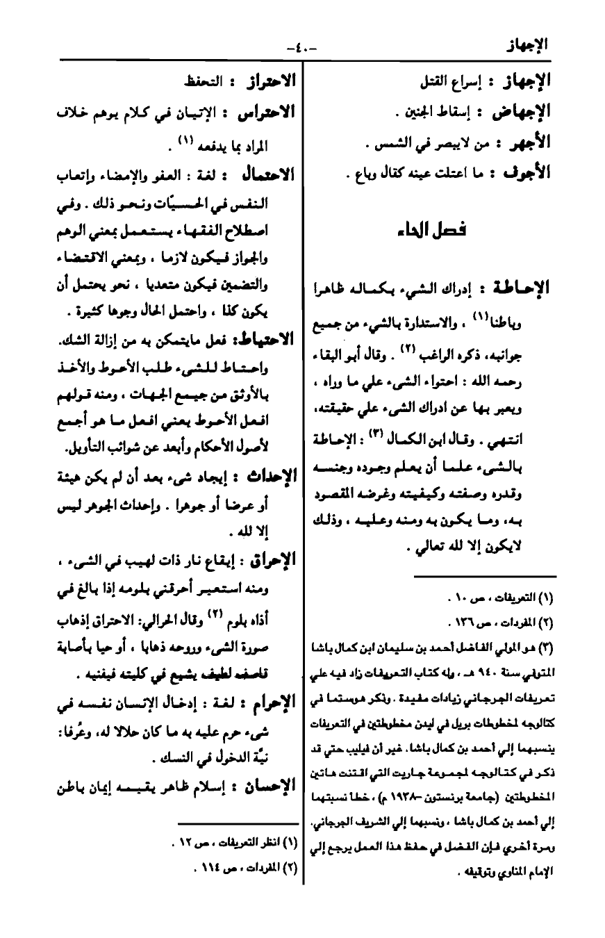 3 هو المولى الفاضل أحمد بن سليمان بن كمال باشا المتوفى سنة 940هـ، وله كتاب التعريفات زاد فيه على تعريفات الجرجاني زيادات مفيدة. وذكر هوستما في كتالوجه لمخطوطات بريل في ليدن مخطوطتين في التعريفات ينسبهما إلى أحمد بن كمال باشا. غير أن فيليب حتى قد ذكر في كتالوجه لمجموعة جاريت التي اقتنت هاتين المخطوطتين "جامعة برنستون 1938م". خطأ نسبتهما إلى أحمد بن كمال باشا، ونسبهما إلى الشريف الجرجاني. ومرة أخرى فإن الفضل في حفظ هذا العمل يرجع إلى الإمام المناوي وتوقيفه.
