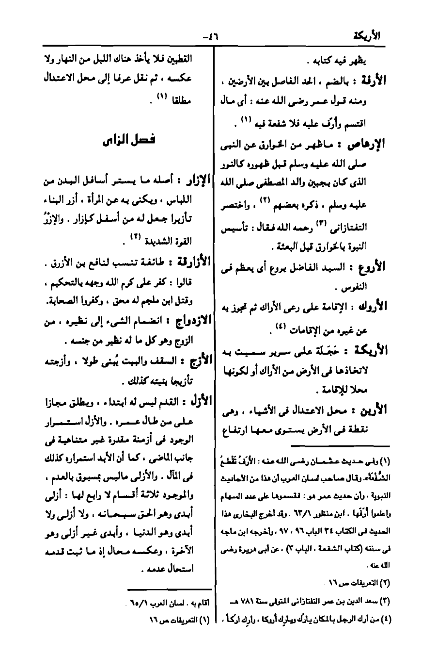 1 وفي حديث عثمان رضي الله عنه: الأرف تقطع الشفعة، وقال صاحب لسان العرب إن هذا من الأحاديث النبوية، وأن حديث عمر وهو: فقسموها على عدد السهام واعلموا أرفها. ابن منظور 1/ 63. وقد أخرج البخاري هذا الحديث في الكتاب 34 الباب 96، 97، وأخرجه ابن ماجه في سنته "كتاب الشفعة، الباب 3"، عن أبي هريرة رضي الله عنه.