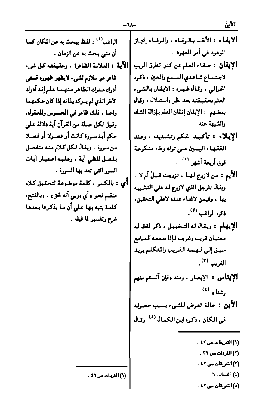 الأين: حالة تعرض للشيء بسبب حصوله في المكان، ذكره ابن الكمال5. وقال الراغب6: لفظ يبحث به عن المكان كما أن متى يبحث به عن الزمان.