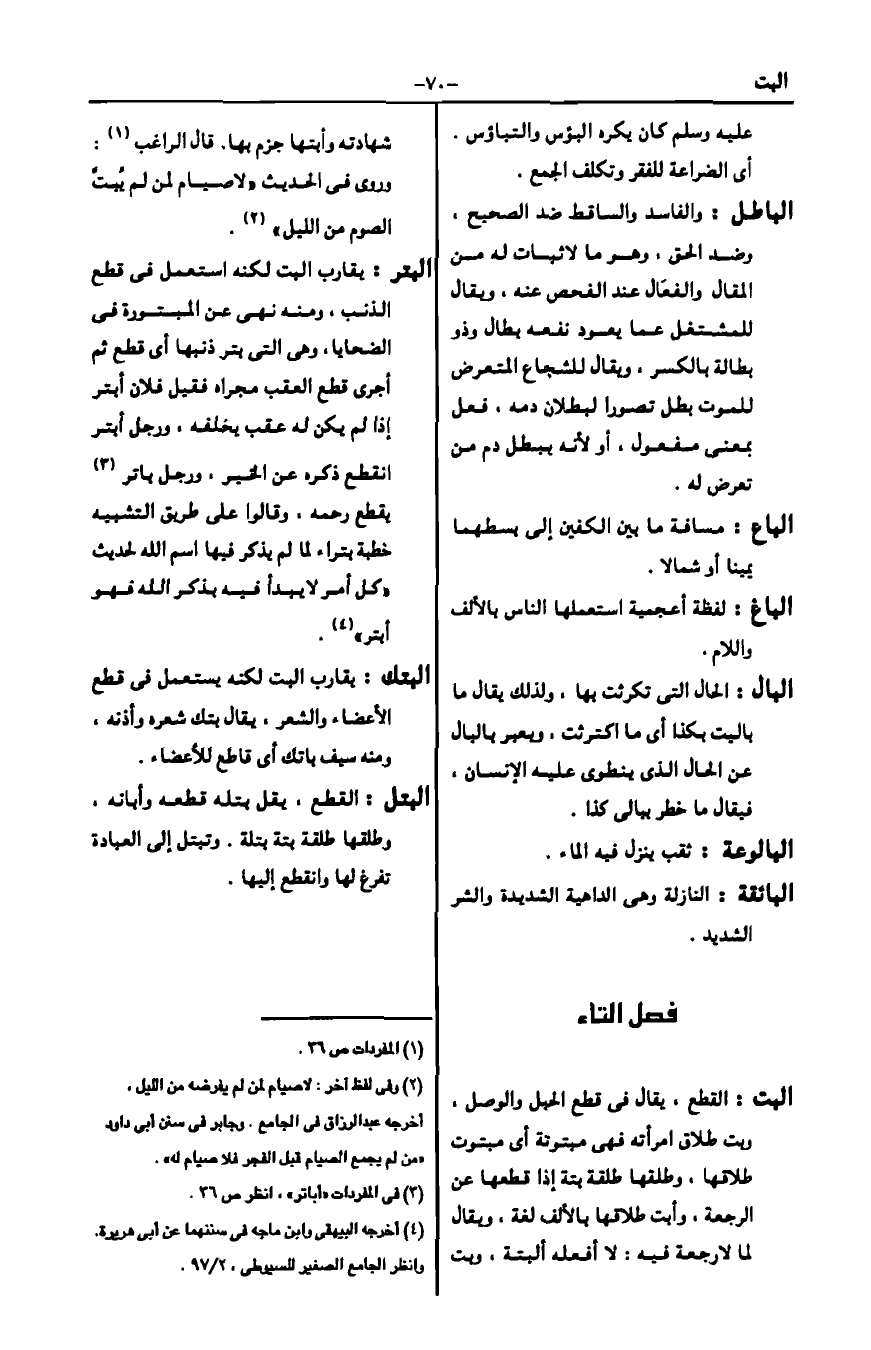 البتر: يقارب البت لكنه استعمل في قطع الذنب، ومنه نهي عن المبتورة في الضحايا، وهي التي بتر ذنبها أي قطع ثم أجري قطع العقب مجراه فقيل فلان أبتر إذا لم يكن له عقب يخلفه، ورجل أبتر انقطع ذكره عن الخير، ورجل باتر3 يقطع رحمه، وقالوا على طريق التشبيه خطبة بتراء لما لم يذكر فيها اسم الله لحديث "كل أمر لا يبدأ فيه بذكر الله فهو أبتر" 4.