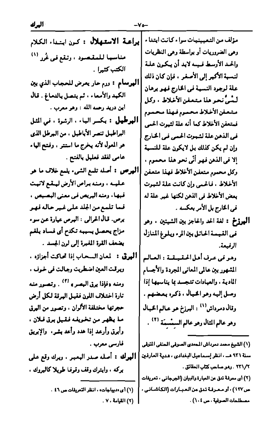 وهو في عرف أهل الحقيقة: العالم المشهور بين عالم المعاني المجردة والأجسام المادية، والعبادات تتجسد بما يناسبها إذا وصل إليه وهو الخيال، ذكره بعضهم وقال دمرداش1: البرزخ هو عالم الخيال وهو عالم المثال وهو عالم السمسمة2.