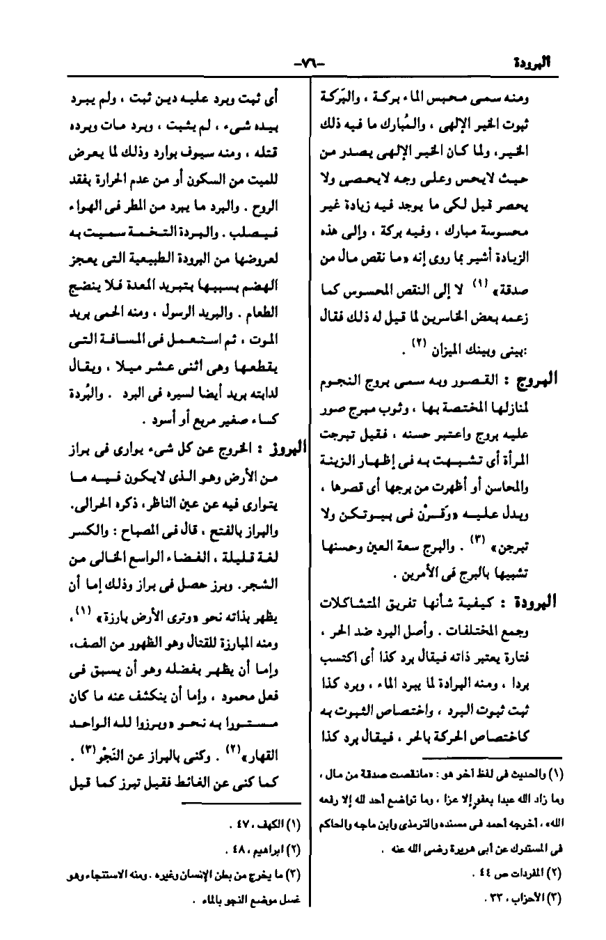 البرودة: كيفية شأنها تفريق المتشاكلات وجمع المختلفات، وأصل البرد ضد الحر، فتارة تعتبر ذاته فيقال برد كذا أي اكتسب بردا، ومنه البرادة لما يبرد الماء، وبرد كذا ثبت ثبوت البرد، واختصاص الثبوت به كاختصاص الحركة بالحر، فيقال برد كذا أي ثبت وبرد عليه دين، ثبت ولم يبرد بيده شيء لم يثبت، وبرد مات وبرده قتله، ومنه سيوف بوارد وذلك لما يعرض للميت من السكون أو من عدم الحرارة بفقد الروح. والبرد ما يبرد من المطر في الهواء فيصلب، والبردة التخمة سميت به لعروضها من البرودة الطبيعية التي يعجز الهضم بسببها بتبريد المعدة فلا ينضج الطعام. والبريد الرسول، ومنه الحمى بريد الموت، ثم استعمل في المسافة التي يقطعها وهي اثنا عشر ميلا، ويقال لدابته بريد أيضًا لسيره في البرد، والبردة كساء صغير مربع أو أسود.