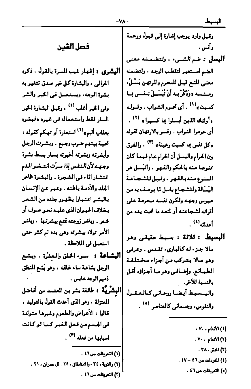 البشرى: إظهار غيب المسرة بالقول، ذكره الحرالي، البشارة كل خبر صادق تتغير به بشرة الوجه، وتستعمل في الخير والشر وفي الخير أغلب1، وقيل البشارة الخبر السار فقط واستعماله في غيره {فَبَشِّرْهُ بِعَذَابٍ أَلِيم} 2 استعارة أو تهكم كقوله: تحية بينهم ضرب وجيع. وبشرت الرجل وأبشرته وبشرته أخبرته بسار بسط بشرة وجهه لأن النفس إذا سرت انتشر الدم انتشار الماء في الشجرة. والبشرة ظاهر الجلد والأدمة باطنه. وعبر عن الإنسان بالبشر اعتبارا بظهور جلده من الشعر بخلاف الحيوان الذي عليه نحو صوف أو شعر. وباشر زوجته تمتع ببشرتها، وباشر الأمر تولاه ببشرته وهي يده ثم كثر حتى استعمل في الملاحظة.