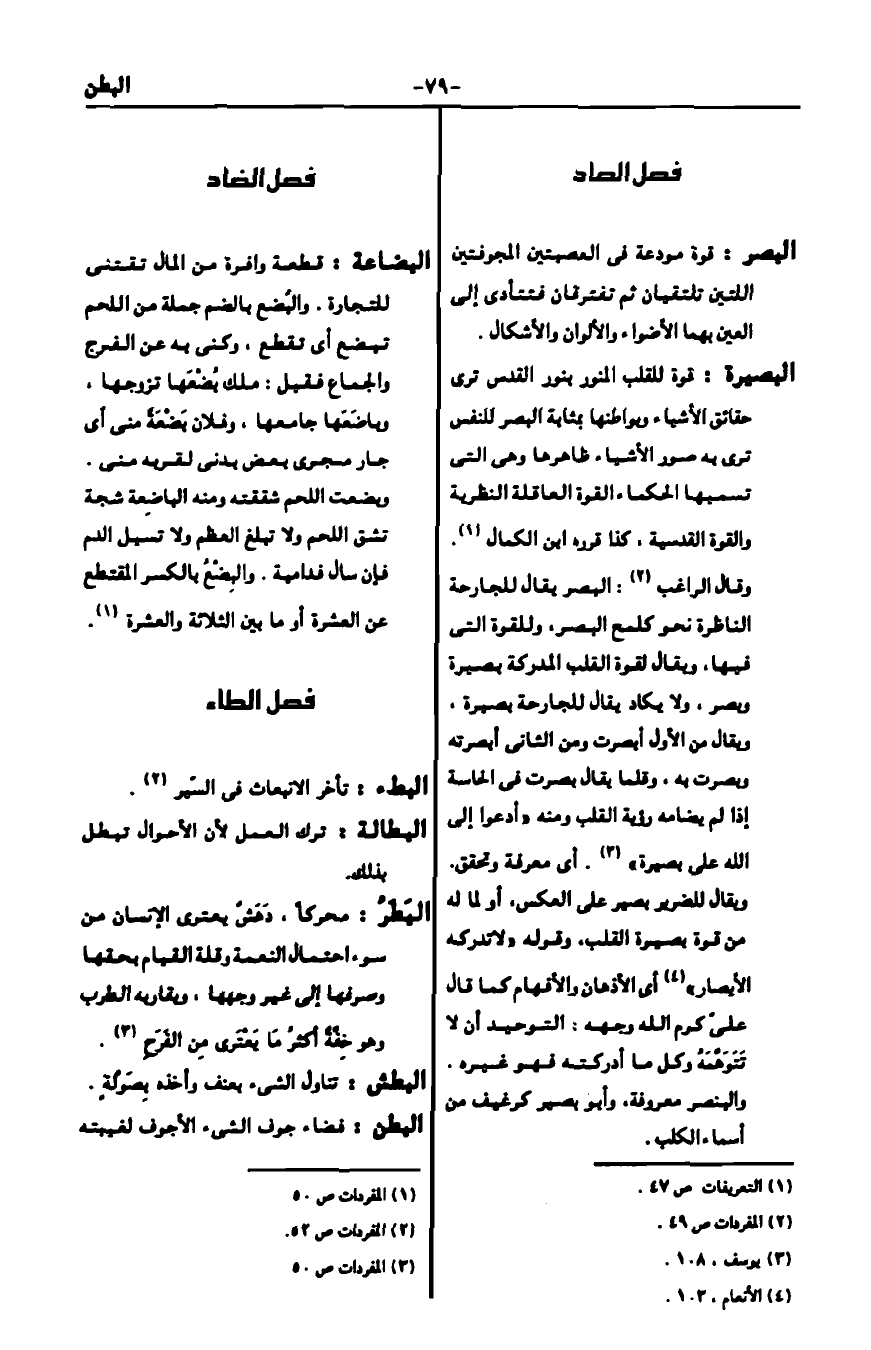 وقال الراغب2: البصر يقال للجارحة الناظرة نحو كلمح بالبصر، وللقوة التي فيها، ويقال لقوة القلب المدركة بصيرة وبصر، ولا يكاد يقال للجارحة بصيرة، ويقال من الأول أبصرت ومن الثاني أبصرته وبصرت به، وقلما يقال في الحاسة إذا لم يضامه رؤية القلب ومنه {أَدْعُو إِلَى اللَّهِ عَلَى بَصِيرَةٍ} 3. أي معرفة وتحقق. ويقال للضرير بصير على العكس، أو لما له من قوة بصيرة القلب، وقوله {لا تُدْرِكُهُ الأَبْصَار} 4 أي الأذهان والأفهام كما قال علي كرم الله وجهه: التوحيد ألا تتوهمه وقال كل ما أدركته فهو غيره. والبنصر معروفة، وأبو بصير كرغيف من أسماء الكلب.