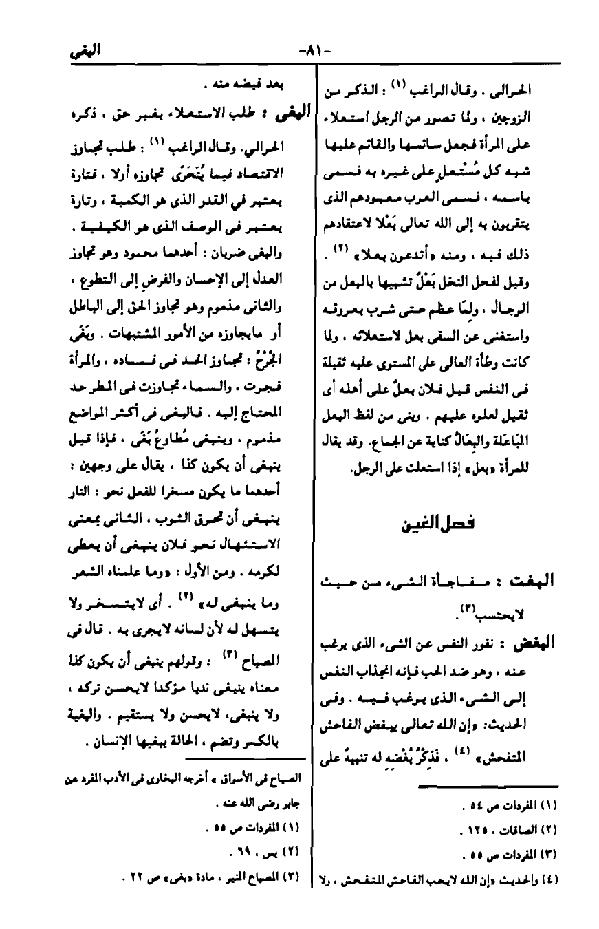 البغي: طلب الاستعلاء بغير حق، ذكره الحرالي. وقال الراغب3: طلب تجاوز الاقتصاد فيما يتحرى تجاوزه أولا، فتارة يعتبر في المقدار الذي هو الكمية، وتارة يعتبر في الوصف الذي هو الكيفية. والبغي ضربان: أحدهما محمود وهو تجاوز العدل إلى الإحسان والفرض إلى التطوع، والثاني مذموم وهو تجاوز الحق إلى الباطل أو ما يجاوره من الأمور المشتبهات. وبغى الجرح: تجاوز الحد في فساده، والمرأة فجرت، والسماء تجاوزت في المطر حد المحتاج إليه. فالبغي في أكثر المواضع مذموم، وينبغي مطاوع بغى، فإذا قيل ينبغي أن يكون كذا، يقال على وجهين: أحدهما ما يكون مسخرا للفعل نحو: النار ينبغي أن تحرق الثوب، الثاني بمعنى الاستئهال نحو فلان ينبغي أن يعطي لكرمه. ومن الأول: {وَمَا عَلَّمْنَاهُ الشِّعْرَ وَمَا يَنْبَغِي لَهُ} 4. أي لا يتسخر ولا يتسهل له لأن لسانه لا يجري به قال في المصباح5: وقولهم ينبغي كذا أن يكون معناه ينبغي ندبا مؤكدا لا يحسن تركه، ولا ينبغي، لا يحسن ولا يستقيم والبغية بالكسر وتضم، الحالة التي يبغيها الإنسان.