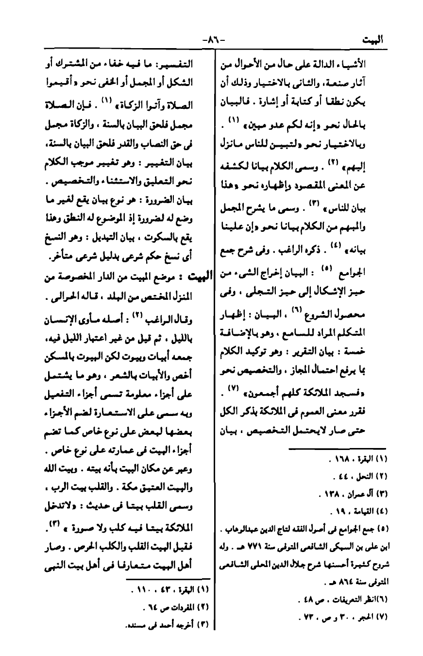 البيان: المنطق الفصيح المعرب عما في الضمير، كذا في الكشاف. وفي المفردات1: الكشف وهو أعم من النطق لأن النطق باللسان، ويسمى ما يبين بيانا. والبيان ضربان: أحدهما بالتسخير وهي الأشياء الدالة على حال من الأحوال من آثار صنعة والثاني بالاختبار وذلك إما أن يكون نطقا أو كتابة أو إشارة. فالبيان بالحال نحو {إِنَّهُ لَكُمْ عَدُوٌّ مُبِين} 2. وبالاختبار نحو {لِتُبَيِّنَ لِلنَّاسِ مَا نُزِّلَ إِلَيْهِمْ} 3. وسمي الكلام بيانا لكشفه عن المعنى المقصود إظهاره نحو {هَذَا بَيَانٌ لِلنَّاس} 4. وسمي ما يشرح المجمل والمبهم من الكلام بيانا نحو {إِنَّ عَلَيْنَا بَيَانَه} 5. ذكره الراغب. وفي شرح جمع الجوامع6: البيان إخراج الشيء من حيز الإشكال إلى حيز التجلي، وفي، محصول الشروع7، البيان: إظهار المتكلم المراد للسامع، وهو بالإضافة خمسة: بيان التقرير: وهو توكيد الكلام بما يرفع احتمال المجاز، والتخصيص نحو {فَسَجَدَ الْمَلَائِكَةُ كُلُّهُمْ أَجْمَعُونَ} 8. فقرر معنى العموم في الملائكة بذكر الكل حتى صار لا يحتمل التخصيص. بيان التفسير: ما فيه خفاء من المشترك أو المشكل أو المجمل أو الخفي نحو {وَأَقِيمُوا الصَّلَاةَ وَآتُوا الزَّكَاةَ} 9. فإن الصلاة مجمل فلحق البيان بالسنة، والزكاة مجمل في حق النصاب والقدر فلحق البيان بالسنة، بيان التغيير: وهو تغيير موجب الكلام نحو التعليق والاستثناء والتخصيص، بيان الضرورة: هو نوع بيان يقع بغير ما وضع له لضرورة إذ الموضوع له النطق وهذا يقع بالسكوت، بيان التبديل: وهو النسخ أي نسخ حكم شرعي بدليل شرعي متأخر.