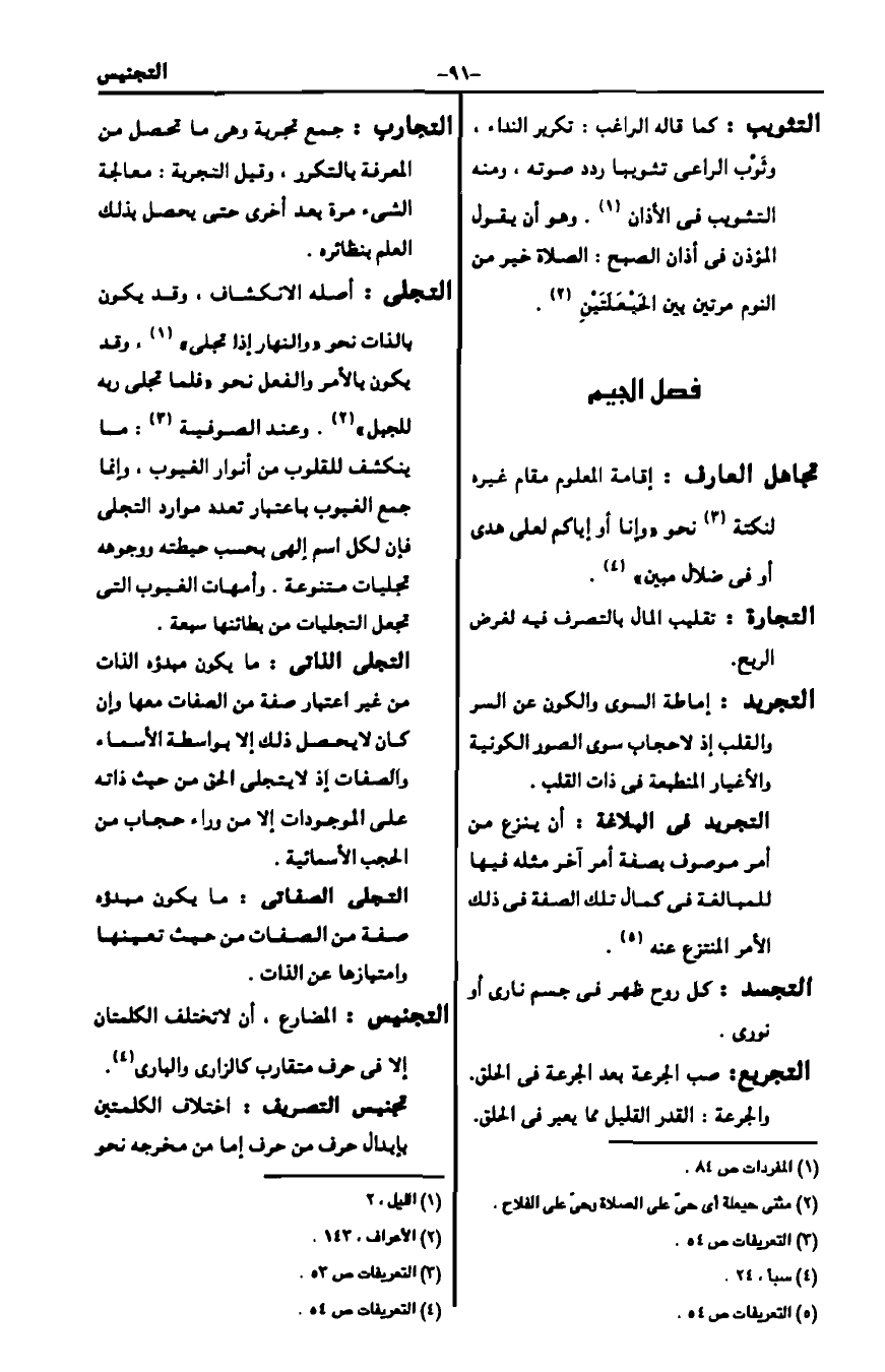 التجلي: أصله الانكشاف، وقد يكون بالذات نحو {وَالنَّهَارِ إِذَا تَجَلَّى} 4، وقد يكون بالأمر والفعل نحو {فَلَمَّا تَجَلَّى رَبُّهُ لِلْجَبَلِ} 5. وعند الصوفية6: ما ينكشف للقلوب من أنوار الغيوب، وإنما جمع الغيوب باعتبار تعدد موارد التجلي فإن لكل اسم إلهي بحسب حيطته ووجوهه تجليات متنوعة. وأمهات الغيوب التي تجعل التجليات من بطائنها سبعة.