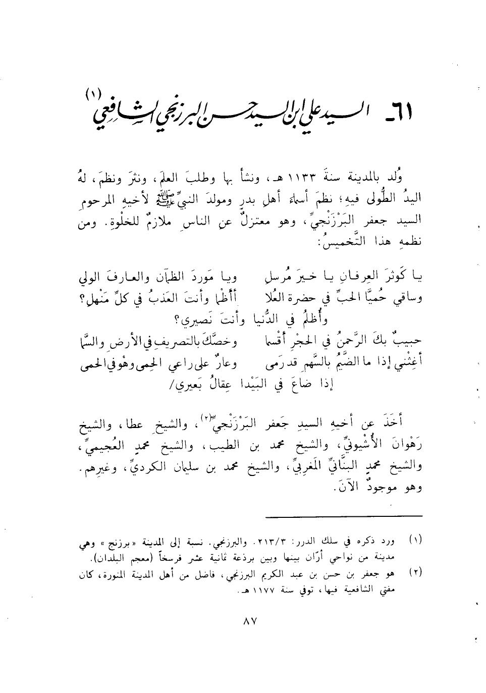 (2) هو جعفر بن حسن بن عبد الكريم البرزنجي، فاضل من أهل المدينة المنورة، كان