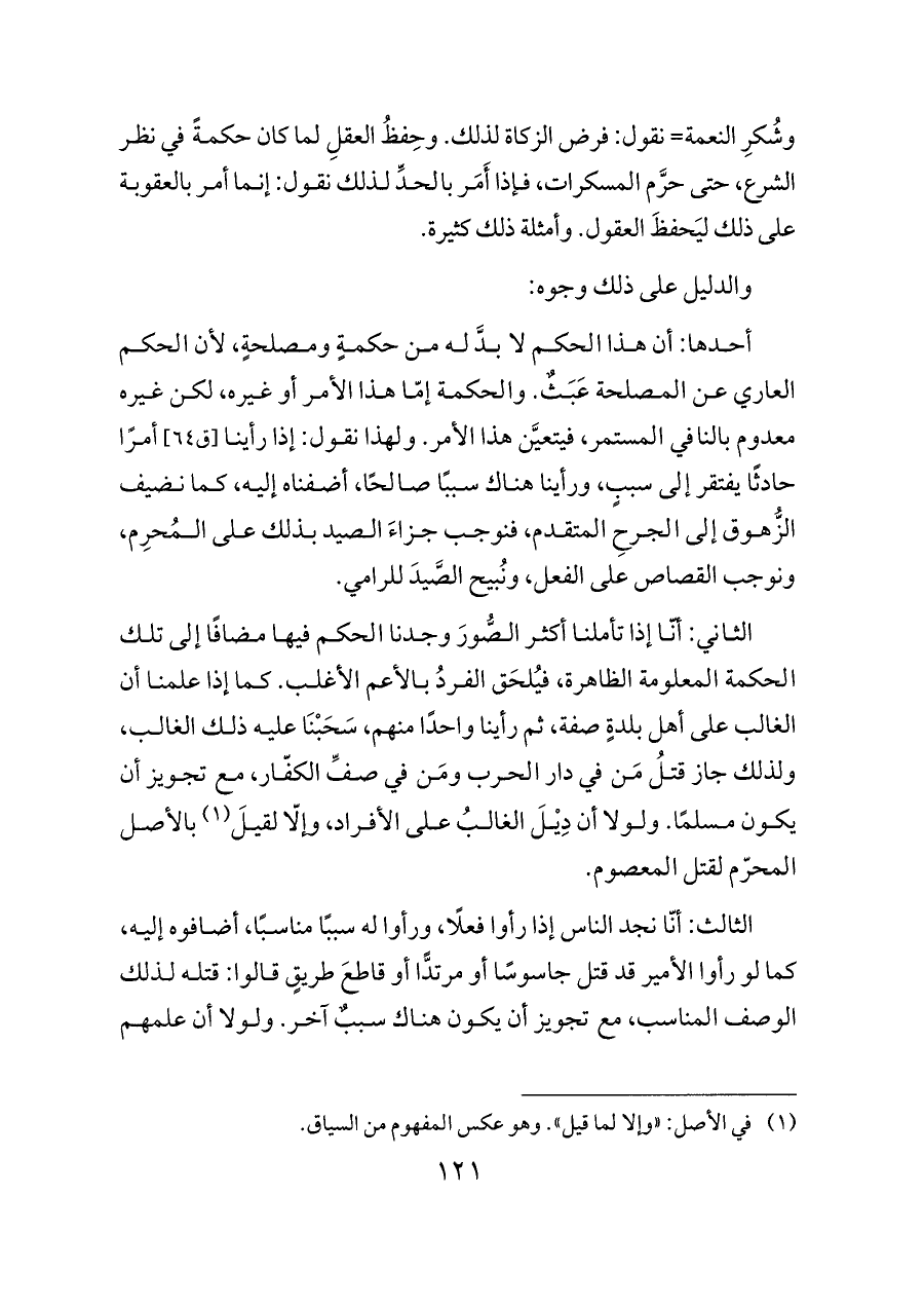 وشُكرِ النعمة= نقول: فرض الزكاة لذلك. وحِفظُ العقلِ لما كان حكمةً في نظر الشرع، حتى حرَّم المسكرات، فإذا أَمَر بالحدِّ لذلك نقول: إنما أمر بالعقوبة على ذلك ليَحفظَ العقول. وأمثلة ذلك كثيرة.
