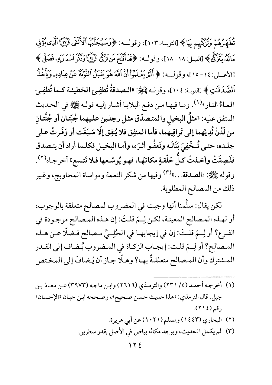تُطَهِّرُهُمْ وَتُزَكِّيهِمْ بِهَا} [التوبة: ١٠٣]، وقوله: {وَسَيُجَنَّبُهَا الْأَتْقَى (١٧) الَّذِي يُؤْتِي مَالَهُ يَتَزَكَّى} [الليل: ١٨ - ١٨]، وقوله: {قَدْ أَفْلَحَ مَنْ تَزَكَّى (١٤) وَذَكَرَ اسْمَ رَبِّهِ فَصَلَّى} [الأعلى: ١٤ - ١٥]، وقوله: {أَلَمْ يَعْلَمُوا أَنَّ اللَّهَ هُوَ يَقْبَلُ التَّوْبَةَ عَنْ عِبَادِهِ وَيَأْخُذُ الصَّدَقَاتِ} [التوبة: ١٠٤]، وقوله - صلى الله عليه وسلم -: «الصدقةُ تُطفِئ الخطيئة كما تُطفِئ الماءُ النار» (¬١). وما فيها من دفع البلايا أشار إليه قوله - صلى الله عليه وسلم - في الحديث المتفق عليه: «مثلُ البخيلِ والمتصدّق مثل رجلين عليهما جُبّتان أو جُنَّتانِ من لَدُنْ ثُدِيِّهما إلى تَراقِيهما، فأما المنفِق فلا يُنفِق إلّا سَبَغَت أو وَفَرتْ على جلده، حتى تُخْفِيَ بَنَانَه وتَعفُو أثرَه، وأما البخيل فكلما أراد أن يتصدق فلَصِقَتْ وأخذتْ كلُّ حَلْقةٍ مكانَها، فهو يُوسّعها فلا تَتسع» أخرجاه (¬٢). وقوله - صلى الله عليه وسلم -: «الصدقة ... » (¬٣) وفيها من شكر النعمة ومواساة المحاويج، وغير ذلك من المصالح المطلوبة.