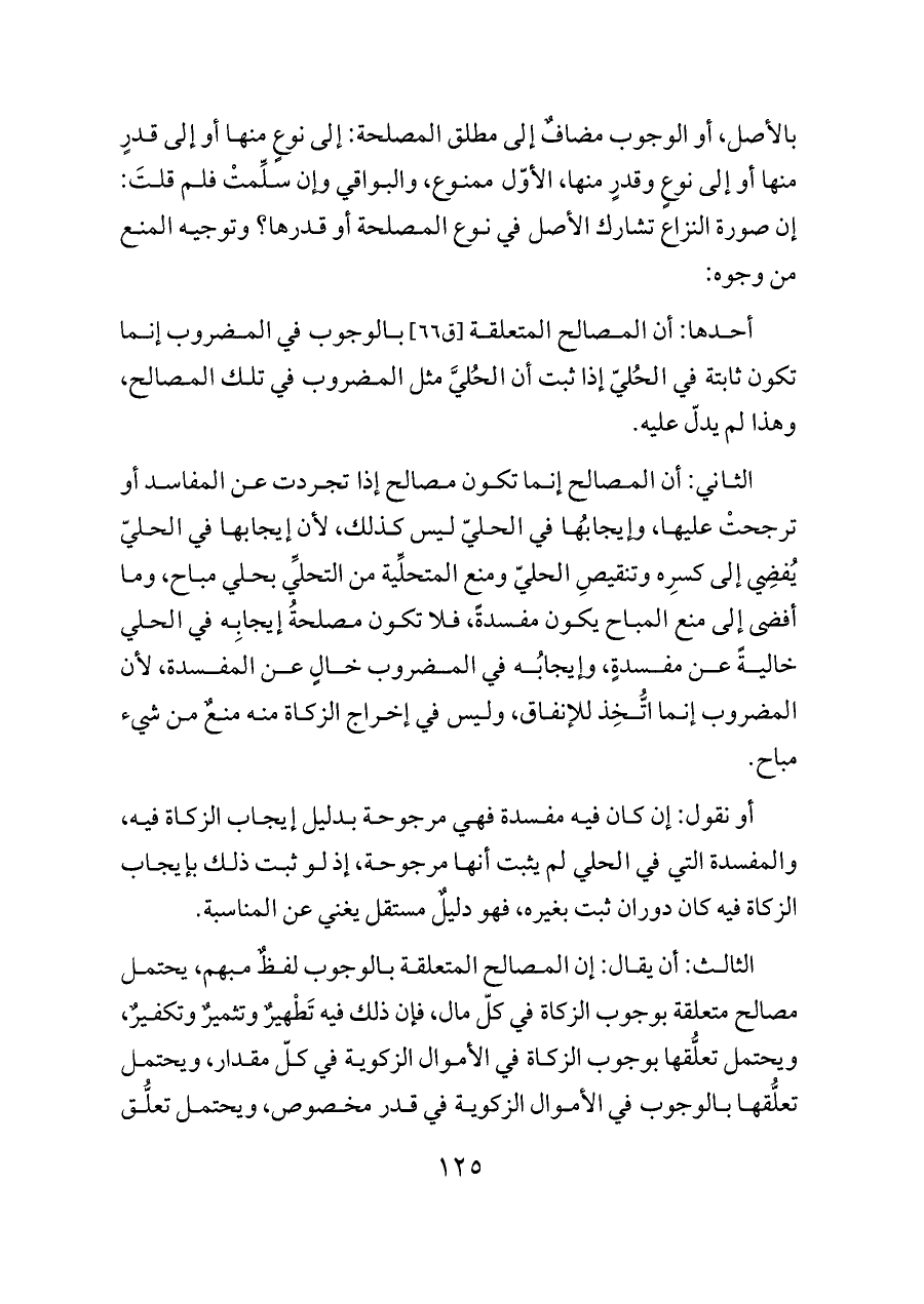 الثالث: أن يقال: إن المصالح المتعلقة بالوجوب لفظٌ مبهم، يحتمل مصالح متعلقة بوجوب الزكاة في كلّ مال، فإن ذلك فيه تَطْهيرٌ وتثميرٌ وتكفيرٌ، ويحتمل تعلُّقها بوجوب الزكاة في الأموال الزكوية في كلّ مقدار، ويحتمل تعلُّقها بالوجوب في الأموال الزكوية في قدر مخصوص، ويحتمل تعلُّق