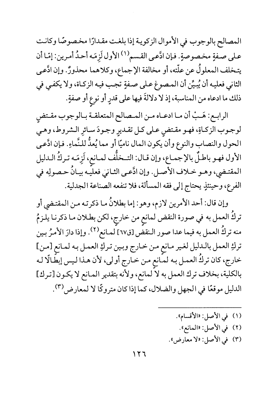 الرابع: هَبْ أن ما ادعاه من المصالح المتعلقة بالوجوب مقتضٍ لوجوب الزكاةِ، فهو مقتضٍ على كل تقديرٍ وجودَ سائرِ الشروط، وهي الحول والنصاب والنوع وأن يكون المال ناميًا أو مما يُعدُّ للنَّماءِ. فإن ادَّعى الأول فهو باطلٌ بالإجماع، وإن قال: التخلُّف لمانعٍ، لَزِمَه تركُ الدليل المقتضي، وهو خلاف الأصل. وإن ادَّعى الثاني فعليه بيانُ حصولِه في الفرع، وحينئذٍ يحتاج إلى فقه المسألة، فلا تنفعه الصناعة الجدلية.