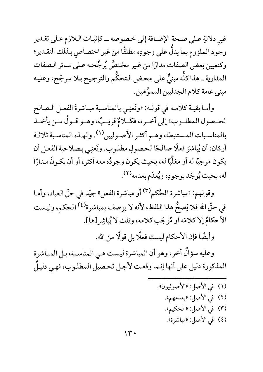 غيرِ دلالةٍ على صحة الإضافة إلى خصوصه ــ كإثبات اللازم على تقدير وجود الملزوم بما يدلُّ على وجودِه مطلقًا من غير اختصاصٍ بذلك التقدير؛ وكتعيين بعض الصفات مدارًا من غير مختصٍّ يُرجِّحه على سائر الصفات المدارية ــ هذا كلُّه مبنيٌّ على محض التحكُّم والترجيح بلا مرجّح، وعليه مبنى عامة كلام الجدليين المموِّهين.