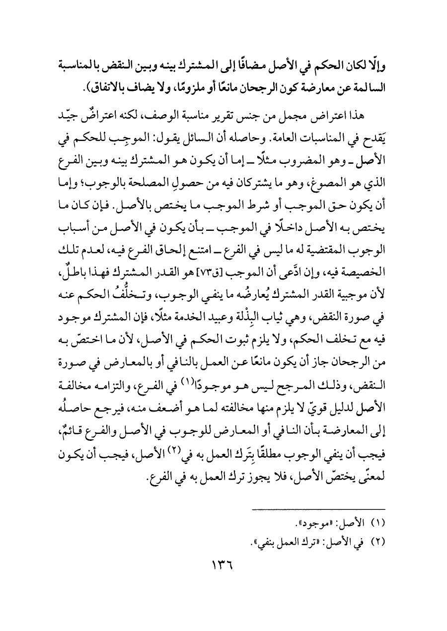 وإلّا لكان الحكم في الأصل مضافًا إلى المشترك بينه وبين النقض بالمناسبة السالمة عن معارضة كون الرجحان مانعًا أو ملزومًا، ولا يضاف بالاتفاق).