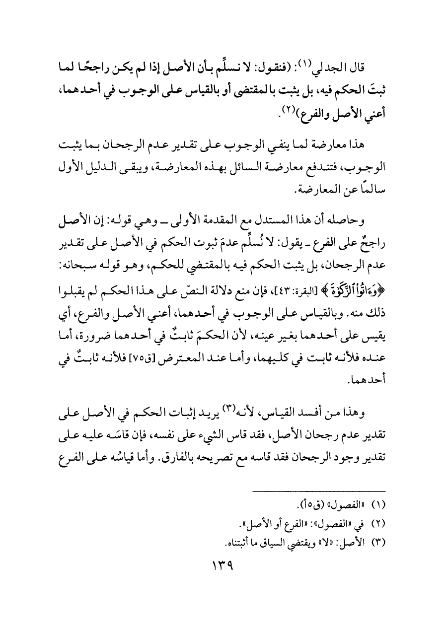 قال الجدلي (¬١): (فنقول: لا نسلِّم بأن الأصل إذا لم يكن راجحًا لما ثبتَ الحكم فيه، بل يثبت بالمقتضى أو بالقياس على الوجوب في أحدهما، أعني الأصل والفرع) (¬٢).
