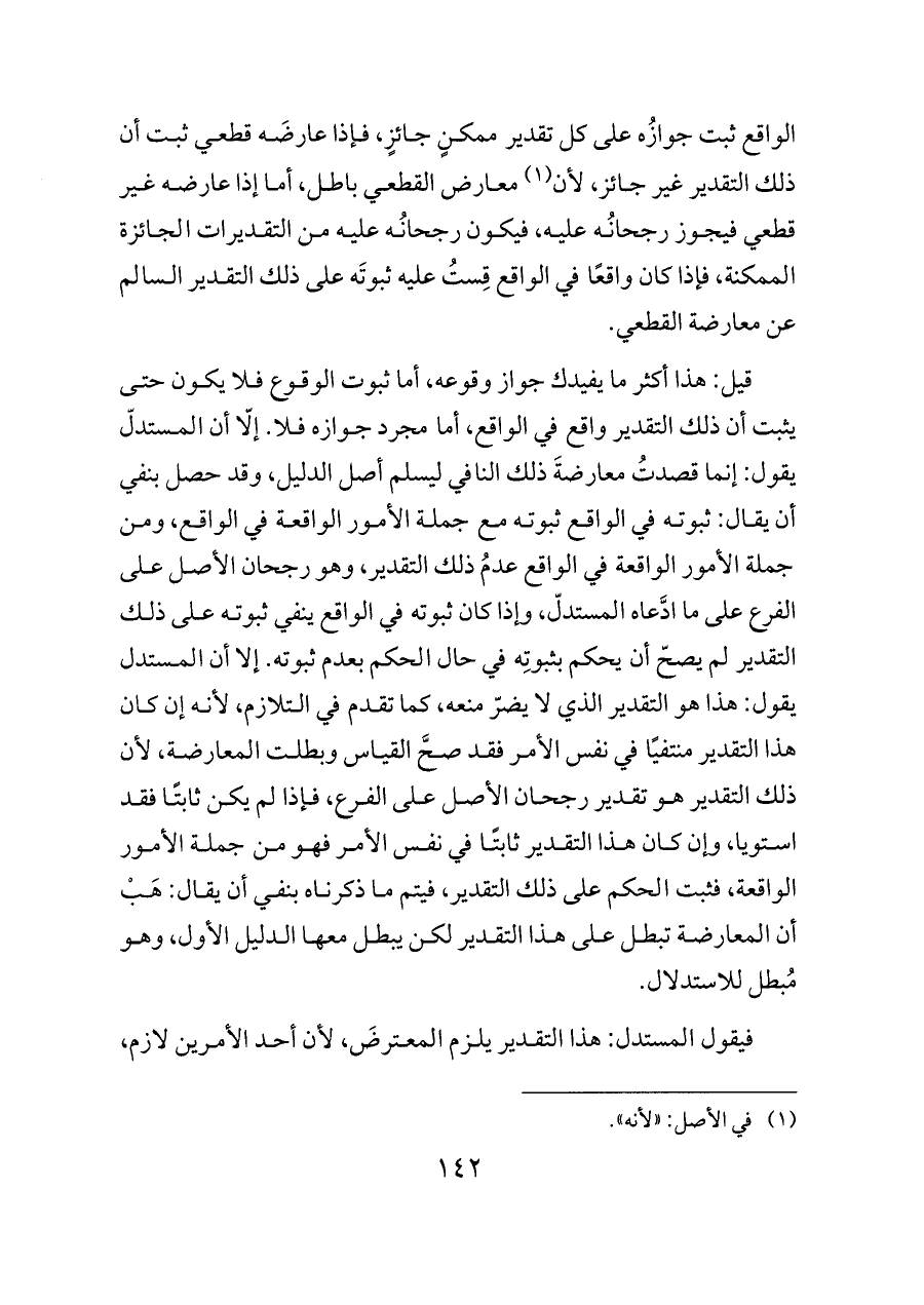 قيل: هذا أكثر ما يفيدك جواز وقوعه، أما ثبوت الوقوع فلا يكون حتى يثبت أن ذلك التقدير واقع في الواقع، أما مجرد جوازه فلا. إلّا أن المستدلّ يقول: إنما قصدتُ معارضةَ ذلك النافي ليسلم أصل الدليل، وقد حصل بنفي أن يقال: ثبوته في الواقع ثبوته مع جملة الأمور الواقعة في الواقع، ومن جملة الأمور الواقعة في الواقع عدمُ ذلك التقدير، وهو رجحان الأصل على الفرع على ما ادَّعاه المستدلّ، وإذا كان ثبوته في الواقع ينفي ثبوته على ذلك التقدير لم يصحّ أن يحكم بثبوتِه في حال الحكم بعدم ثبوته. إلا أن المستدل يقول: هذا هو التقدير الذي لا يضرّ منعه، كما تقدم في التلازم، لأنه إن كان هذا التقدير منتفيًا في نفس الأمر فقد صحَّ القياس وبطلت المعارضة، لأن ذلك التقدير هو تقدير رجحان الأصل على الفرع، فإذا لم يكن ثابتًا فقد استويا، وإن كان هذا التقدير ثابتًا في نفس الأمر فهو من جملة الأمور الواقعة، فثبت الحكم على ذلك التقدير، فيتم ما ذكرناه بنفي أن يقال: هَبْ أن المعارضة تبطل على هذا التقدير لكن يبطل معها الدليل الأول، وهو مُبطل للاستدلال.