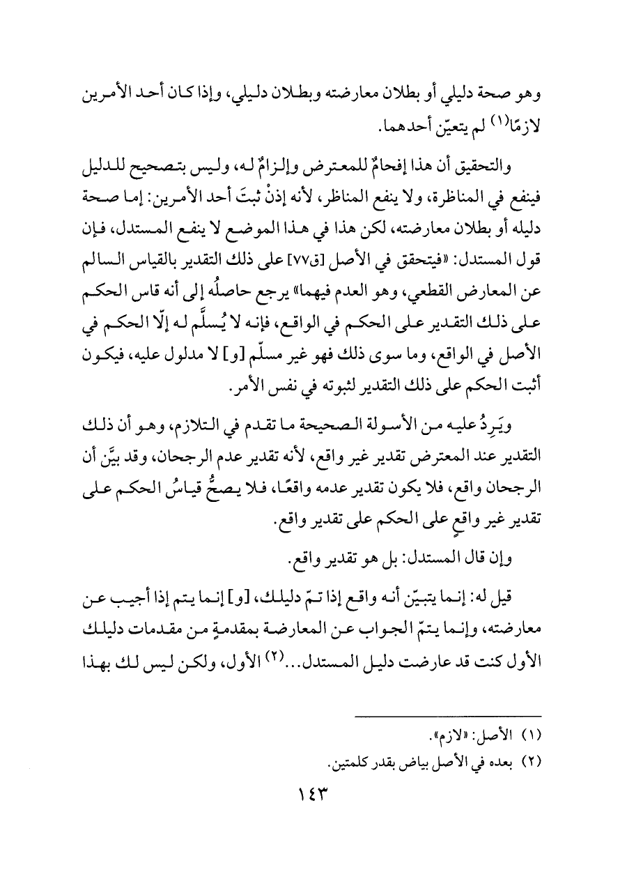 والتحقيق أن هذا إفحامٌ للمعترض وإلزامٌ له، وليس بتصحيح للدليل فينفع في المناظرة، ولا ينفع المناظر، لأنه إذنْ ثبتَ أحد الأمرين: إما صحة دليله أو بطلان معارضته، لكن هذا في هذا الموضع لا ينفع المستدل، فإن قول المستدل: «فيتحقق في الأصل [ق ٧٧] على ذلك التقدير بالقياس السالم عن المعارض القطعي، وهو العدم فيهما» يرجع حاصلُه إلى أنه قاس الحكم على ذلك التقدير على الحكم في الواقع، فإنه لا يُسلَّم له إلّا الحكم في الأصل في الواقع، وما سوى ذلك فهو غير مسلّم [و] لا مدلول عليه، فيكون أثبت الحكم على ذلك التقدير لثبوته في نفس الأمر.