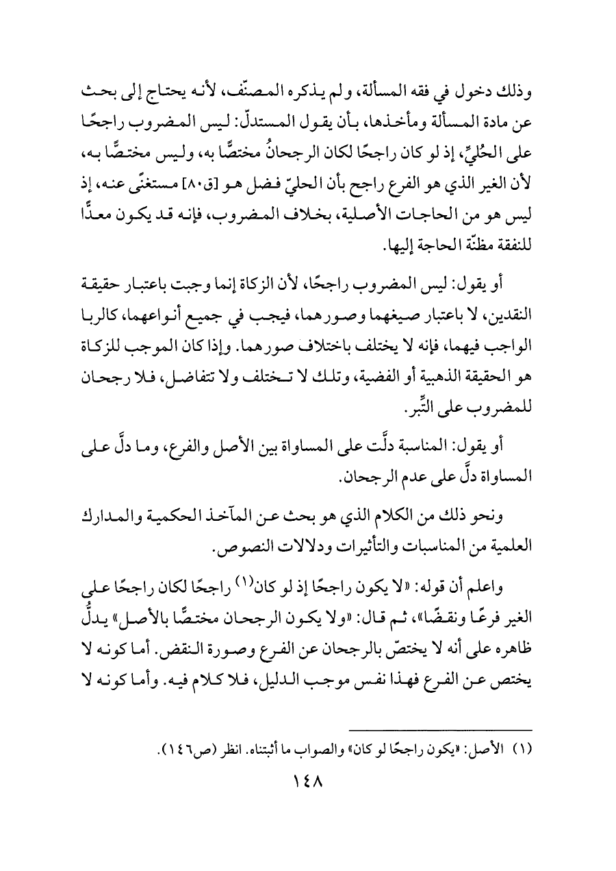 وذلك دخول في فقه المسألة، ولم يذكره المصنّف، لأنه يحتاج إلى بحث عن مادة المسألة ومأخذها، بأن يقول المستدلّ: ليس المضروب راجحًا على الحُليِّ، إذ لو كان راجحًا لكان الرجحانُ مختصًّا به، وليس مختصًّا به، لأن الغير الذي هو الفرع راجح بأن الحليّ فضل هو [ق ٨٠] مستغنًى عنه، إذ ليس هو من الحاجات الأصلية، بخلاف المضروب، فإنه قد يكون معدًّا للنفقة مظنّة الحاجة إليها.