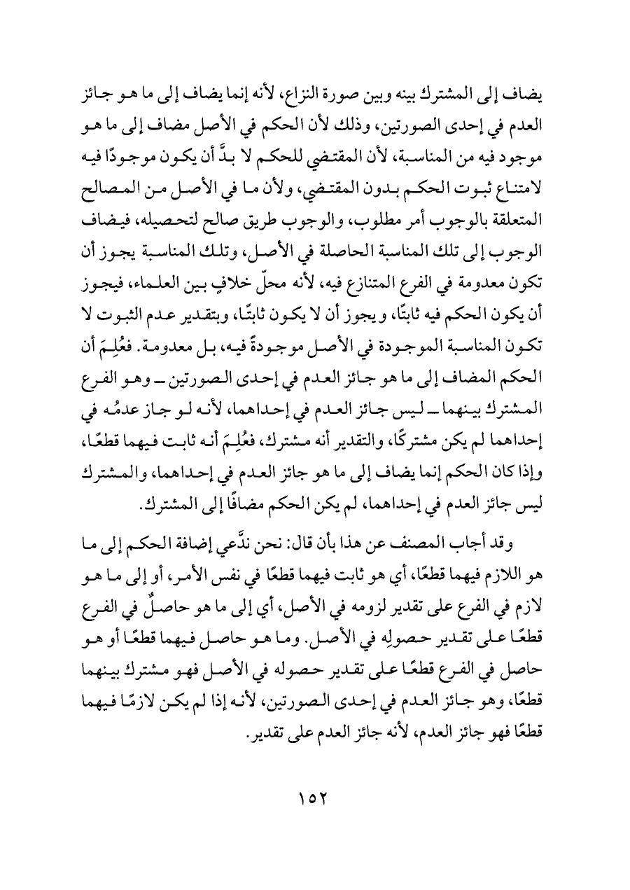 وقد أجاب المصنف عن هذا بأن قال: نحن ندَّعي إضافة الحكم إلى ما هو اللازم فيهما قطعًا، أي هو ثابت فيهما قطعًا في نفس الأمر، أو إلى ما هو لازم في الفرع على تقدير لزومه في الأصل، أي إلى ما هو حاصلٌ في الفرع قطعًا على تقدير حصولِه في الأصل. وما هو حاصل فيهما قطعًا أو هو حاصل في الفرع قطعًا على تقدير حصوله في الأصل فهو مشترك بينهما قطعًا، وهو جائز العدم في إحدى الصورتين، لأنه إذا لم يكن لازمًا فيهما قطعًا فهو جائز العدم، لأنه جائز العدم على تقدير.