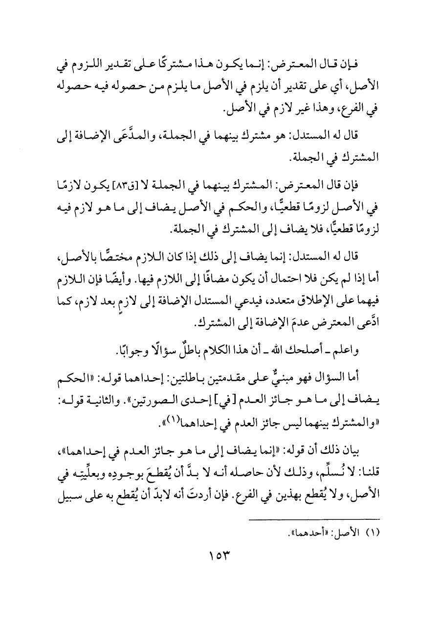 فإن قال المعترض: المشترك بينهما في الجملة لا [ق ٨٣] يكون لازمًا في الأصل لزومًا قطعيًّا، والحكم في الأصل يضاف إلى ما هو لازم فيه لزومًا قطعيًّا، فلا يضاف إلى المشترك في الجملة.