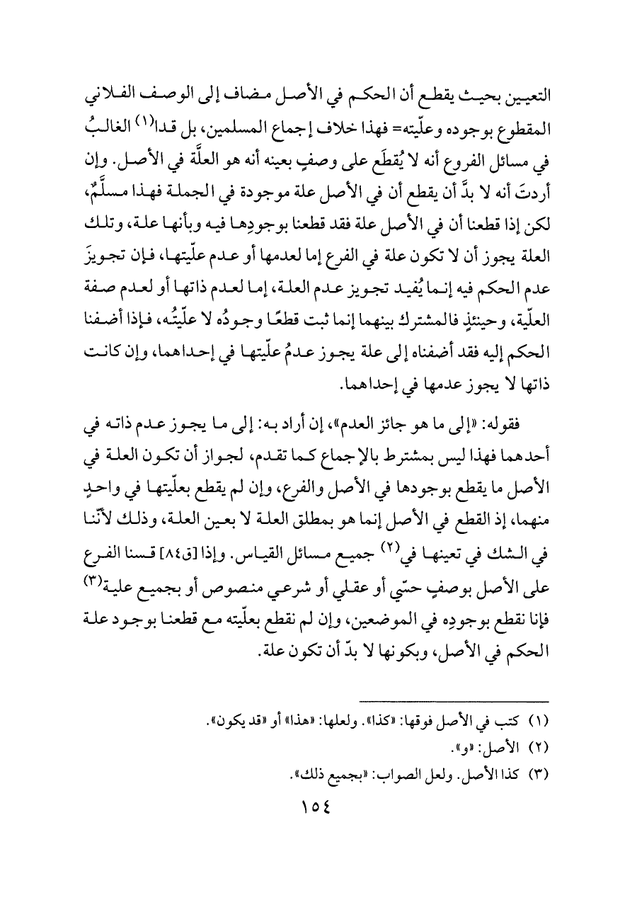 فقوله: «إلى ما هو جائز العدم»، إن أراد به: إلى ما يجوز عدم ذاته في أحدهما فهذا ليس بمشترط بالإجماع كما تقدم، لجواز أن تكون العلة في الأصل ما يقطع بوجودها في الأصل والفرع، وإن لم يقطع بعلّيتها في واحدٍ منهما، إذ القطع في الأصل إنما هو بمطلق العلة لا بعين العلة، وذلك لأنّنا في الشك في تعينها في (¬٢) جميع مسائل القياس. وإذا [ق ٨٤] قسنا الفرع على الأصل بوصفٍ حسّي أو عقلي أو شرعي منصوص أو بجميع علية (¬٣) فإنا نقطع بوجودِه في الموضعين، وإن لم نقطع بعلّيته مع قطعنا بوجود علة الحكم في الأصل، وبكونها لا بدّ أن تكون علة.