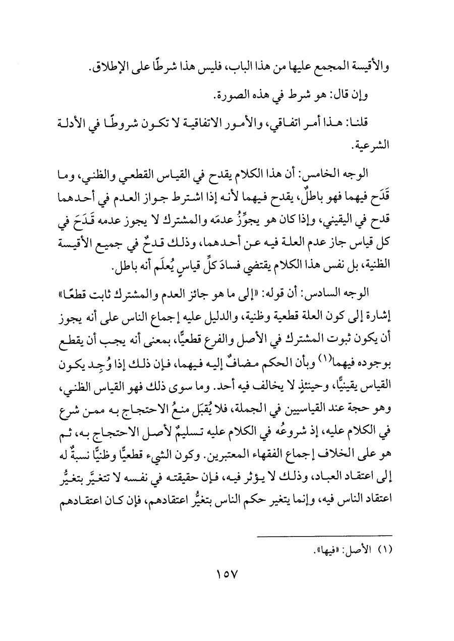 الوجه السادس: أن قوله: «إلى ما هو جائز العدم والمشترك ثابت قطعًا» إشارة إلى كون العلة قطعية وظنية، والدليل عليه إجماع الناس على أنه يجوز أن يكون ثبوت المشترك في الأصل والفرع قطعيًّا، بمعنى أنه يجب أن يقطع بوجوده فيهما (¬١) وبأن الحكم مضافٌ إليه فيهما، فإن ذلك إذا وُجِد يكون القياس يقينيًّا، وحينئذٍ لا يخالف فيه أحد. وما سوى ذلك فهو القياس الظني، وهو حجة عند القياسيين في الجملة، فلا يُقبَل منعُ الاحتجاج به ممن شرع في الكلام عليه، إذ شروعُه في الكلام عليه تسليمٌ لأصل الاحتجاج به، ثم هو على الخلاف إجماع الفقهاء المعتبرين. وكون الشيء قطعيًّا وظنيًّا نسبةٌ له إلى اعتقاد العباد، وذلك لا يؤثر فيه، فإن حقيقته في نفسه لا تتغيَّر بتغيُّر اعتقاد الناس فيه، وإنما يتغير حكم الناس بتغيُّر اعتقادهم، فإن كان اعتقادهم