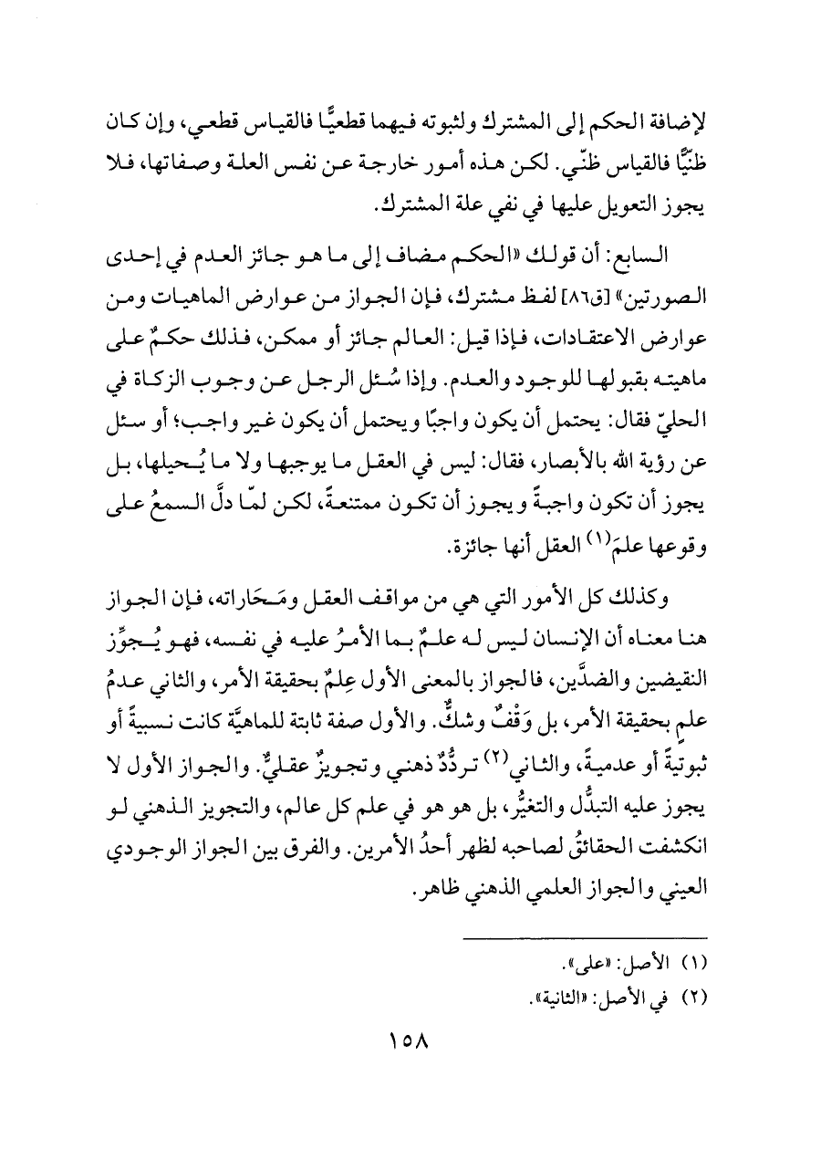 السابع: أن قولك «الحكم مضاف إلى ما هو جائز العدم في إحدى الصورتين» [ق ٨٦] لفظ مشترك، فإن الجواز من عوارض الماهيات ومن عوارض الاعتقادات، فإذا قيل: العالم جائز أو ممكن، فذلك حكمٌ على ماهيته بقبولها للوجود والعدم. وإذا سُئل الرجل عن وجوب الزكاة في الحليّ فقال: يحتمل أن يكون واجبًا ويحتمل أن يكون غير واجب؛ أو سئل عن رؤية الله بالأبصار، فقال: ليس في العقل ما يوجبها ولا ما يُحيلها، بل يجوز أن تكون واجبةً ويجوز أن تكون ممتنعةً، لكن لمّا دلَّ السمعُ على وقوعها علمَ (¬١) العقل أنها جائزة.
