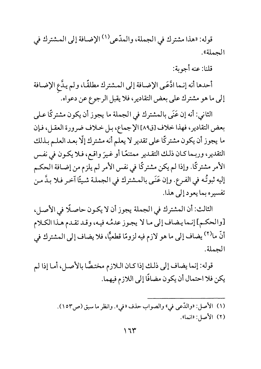 قوله: «هذا مشترك في الجملة، والمدّعى (¬١) الإضافة إلى المشترك في الجملة».
