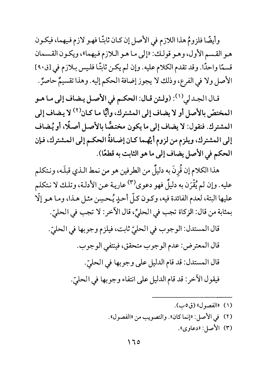 وأيضًا فلزومُ هذا اللازم في الأصل إن كان ثابتًا فهو لازم فيهما، فيكون هو القسم الأول، وهو قولك: «إلى ما هو اللازم فيهما»، ويكون القسمان قسمًا واحدًا. وقد تقدم الكلام عليه. وإن لم يكن ثابتًا فليس بلازم في [ق ٩٠] الأصل ولا في الفرع، وذلك لا يجوز إضافة الحكم إليه. وهذا تقسيمٌ حاصرٌ.