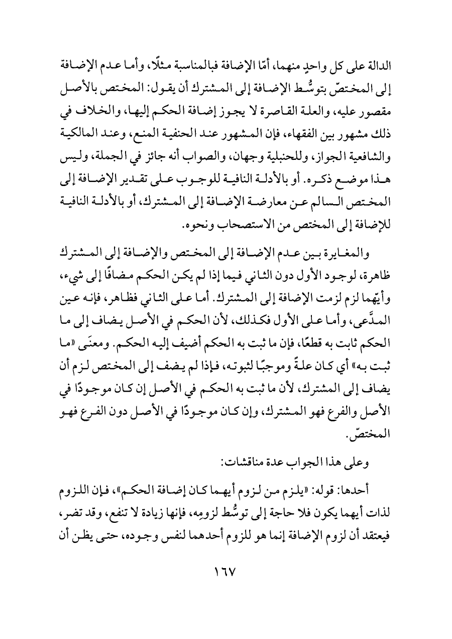 الدالة على كل واحدٍ منهما، أمّا الإضافة فبالمناسبة مثلًا، وأما عدم الإضافة إلى المختصّ بتوسُّط الإضافة إلى المشترك أن يقول: المختص بالأصل مقصور عليه، والعلة القاصرة لا يجوز إضافة الحكم إليها، والخلاف في ذلك مشهور بين الفقهاء، فإن المشهور عند الحنفية المنع، وعند المالكية والشافعية الجواز، وللحنبلية وجهان، والصواب أنه جائز في الجملة، وليس هذا موضع ذكره. أو بالأدلة النافية للوجوب على تقدير الإضافة إلى المختص السالم عن معارضة الإضافة إلى المشترك، أو بالأدلة النافية للإضافة إلى المختص من الاستصحاب ونحوه.