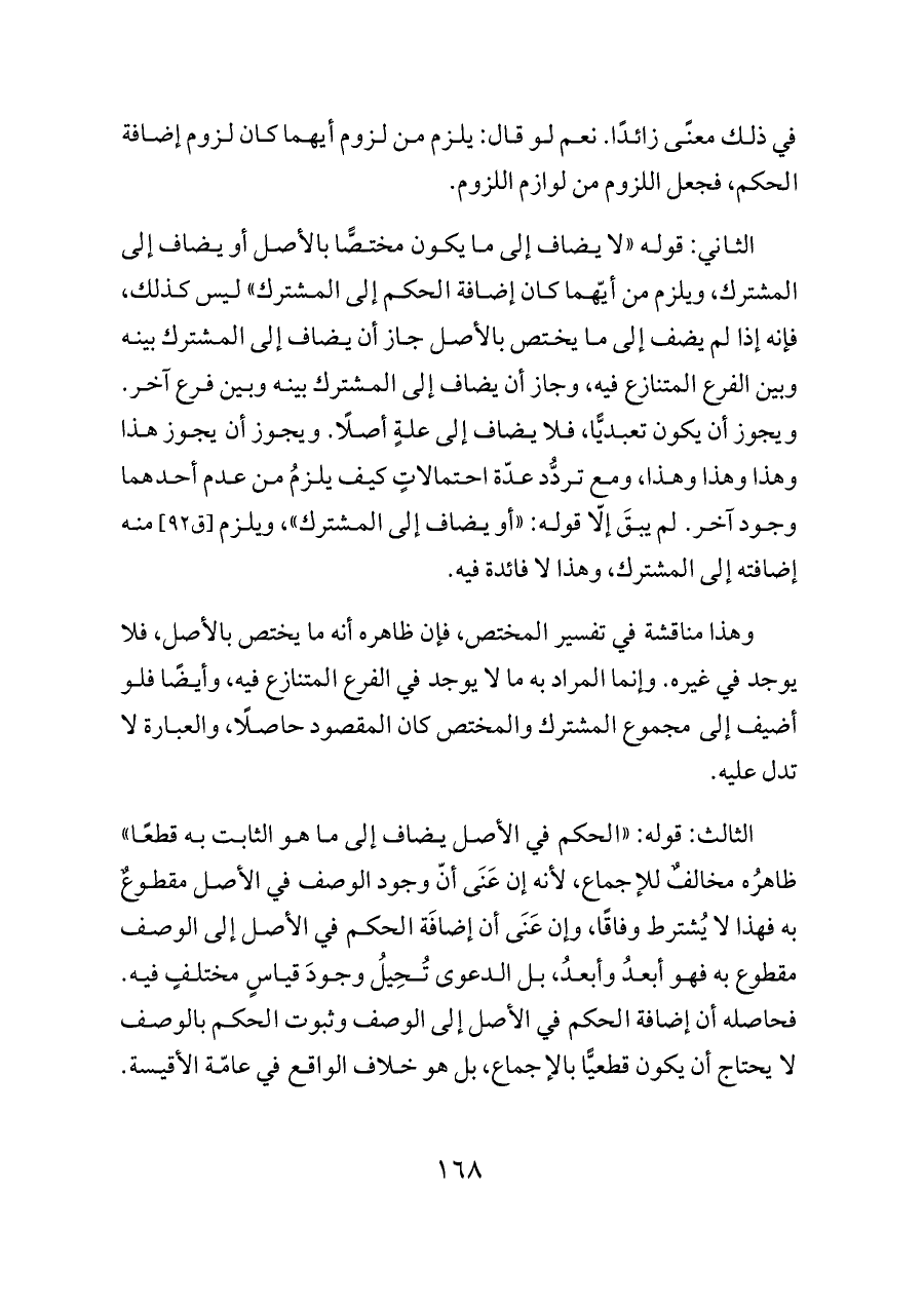 الثاني: قوله «لا يضاف إلى ما يكون مختصًّا بالأصل أو يضاف إلى المشترك، ويلزم من أيّهما كان إضافة الحكم إلى المشترك» ليس كذلك، فإنه إذا لم يضف إلى ما يختص بالأصل جاز أن يضاف إلى المشترك بينه وبين الفرع المتنازع فيه، وجاز أن يضاف إلى المشترك بينه وبين فرع آخر. ويجوز أن يكون تعبديًّا، فلا يضاف إلى علةٍ أصلًا. ويجوز أن يجوز هذا وهذا وهذا وهذا، ومع تردُّد عدّة احتمالاتٍ كيف يلزمُ من عدم أحدهما وجود آخر. لم يبقَ إلّا قوله: «أو يضاف إلى المشترك»، ويلزم [ق ٩٢] منه إضافته إلى المشترك، وهذا لا فائدة فيه.