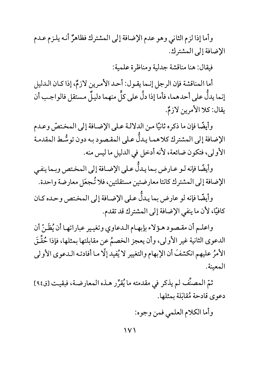 ثمّ المصنِّف لم يذكر في مقدمته ما يُقرِّر هذه المعارضة، فبقيت [ق ٩٤] دعوى قادحة مُقابَلة بمثلها.