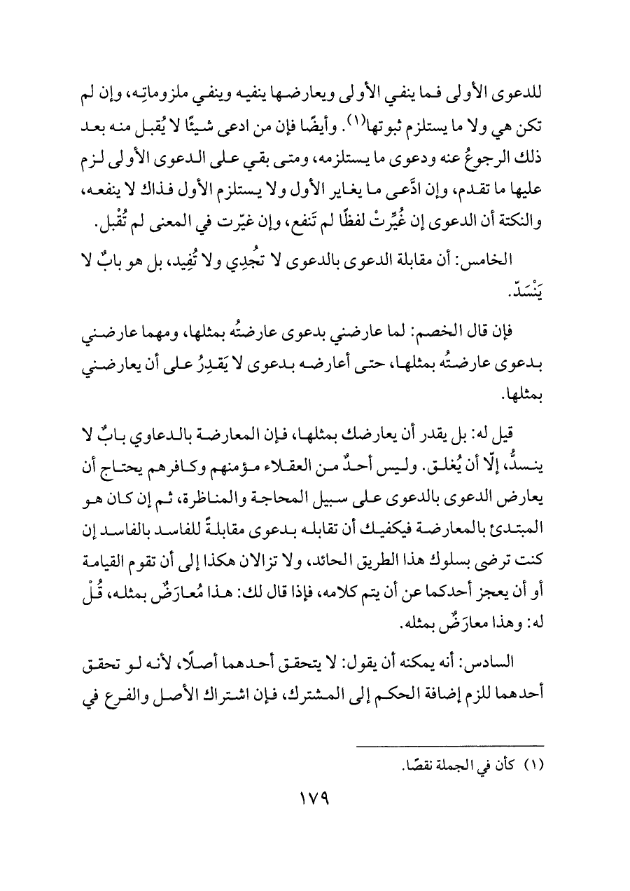 قيل له: بل يقدر أن يعارضك بمثلها، فإن المعارضة بالدعاوي بابٌ لا ينسدُّ، إلّا أن يُغلق. وليس أحدٌ من العقلاء مؤمنهم وكافرهم يحتاج أن يعارض الدعوى بالدعوى على سبيل المحاجة والمناظرة، ثم إن كان هو المبتدئ بالمعارضة فيكفيك أن تقابله بدعوى مقابلةً للفاسد بالفاسد إن كنت ترضى بسلوك هذا الطريق الحائد، ولا تزالان هكذا إلى أن تقوم القيامة أو أن يعجز أحدكما عن أن يتم كلامه، فإذا قال لك: هذا مُعارَضٌ بمثله، قُلْ له: وهذا معارَضٌ بمثله.