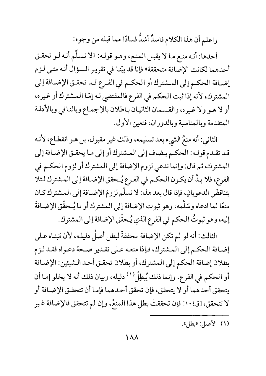 الثاني: أنه منعُ الشيء بعد تسليمه، وذلك غير مقبول، بل هو انقطاع، لأنه قد تقدم قوله: الحكم يضاف إلى المشترك أو إلى ما يحقق الإضافة إلى المشترك، ثم قال: وإنما ندعي لزوم الإضافة إلى المشترك أو لزوم الحكم في الفرع، فلا بدَّ أن يكون الحكم في الفرع يُحقق الإضافة إلى المشترك لئلا يتناقضَ الدعويانِ، فإذا قال بعد هذا: لا نسلّم لزومَ الإضافة إلى المشترك كان منعًا لما ادعاه وسَلَّمه، وهو ثبوت الإضافة إلى المشترك أو ما يُحقّق الإضافةَ إليه، وهو ثبوتُ الحكم في الفرع الذي يُحقّق الإضافة إلى المشترك.