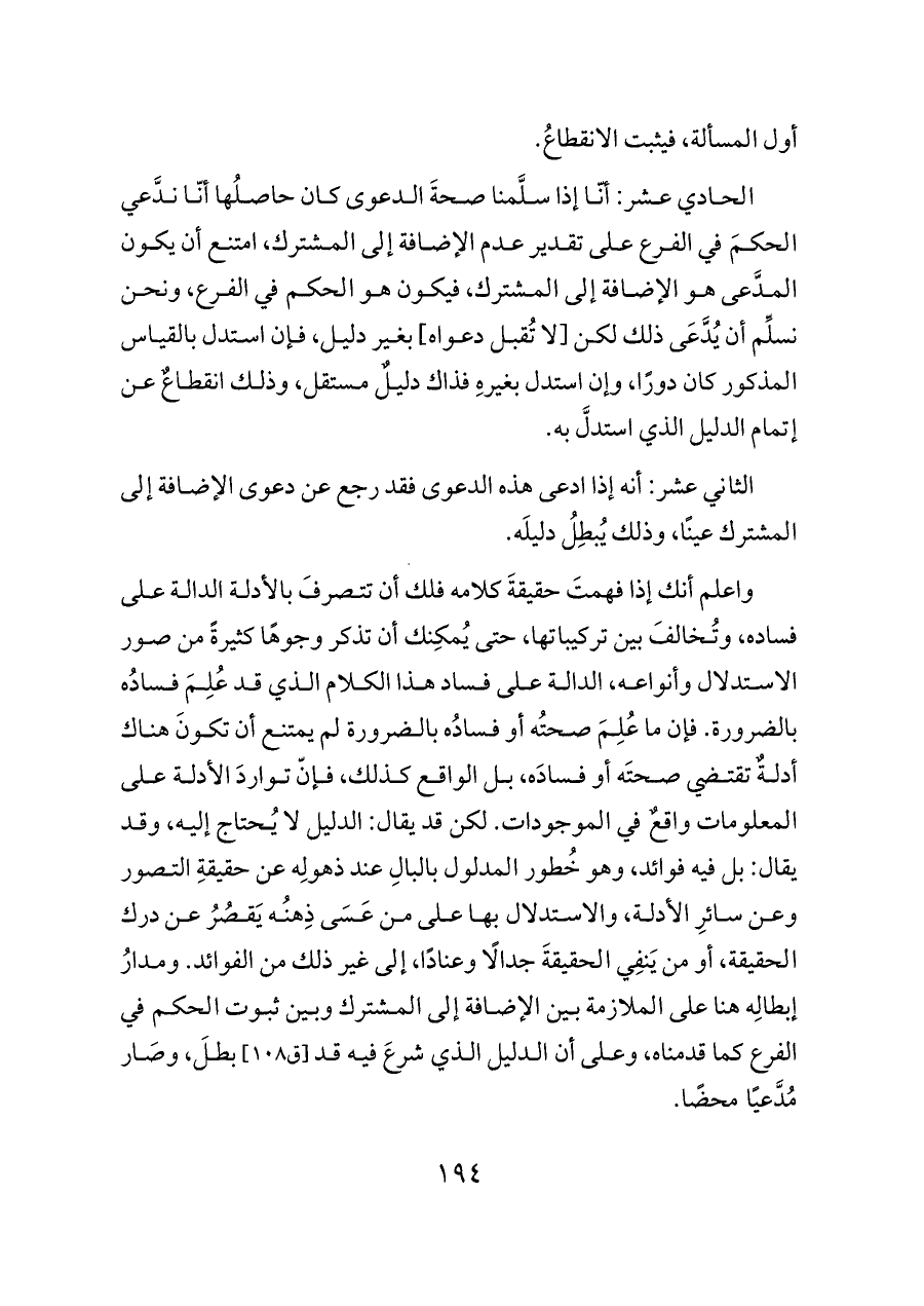 واعلم أنك إذا فهمتَ حقيقةَ كلامه فلك أن تتصرفَ بالأدلة الدالة على فساده، وتُخالفَ بين تركيباتها، حتى يُمكِنك أن تذكر وجوهًا كثيرةً من صور الاستدلال وأنواعه، الدالة على فساد هذا الكلام الذي قد عُلِمَ فسادُه بالضرورة. فإن ما عُلِمَ صحتُه أو فسادُه بالضرورة لم يمتنع أن تكونَ هناك أدلةٌ تقتضي صحتَه أو فسادَه، بل الواقع كذلك، فإنّ تواردَ الأدلة على المعلومات واقعٌ في الموجودات. لكن قد يقال: الدليل لا يُحتاج إليه، وقد يقال: بل فيه فوائد، وهو خُطور المدلول بالبالِ عند ذهولِه عن حقيقةِ التصور وعن سائرِ الأدلة، والاستدلال بها على من عَسَى ذِهنُه يَقصُرُ عن درك الحقيقة، أو من يَنفِي الحقيقةَ جدالًا وعنادًا، إلى غير ذلك من الفوائد. ومدارُ إبطالِه هنا على الملازمة بين الإضافة إلى المشترك وبين ثبوت الحكم في الفرع كما قدمناه، وعلى أن الدليل الذي شرعَ فيه قد [ق ١٠٨] بطلَ، وصَار مُدَّعيًا محضًا.