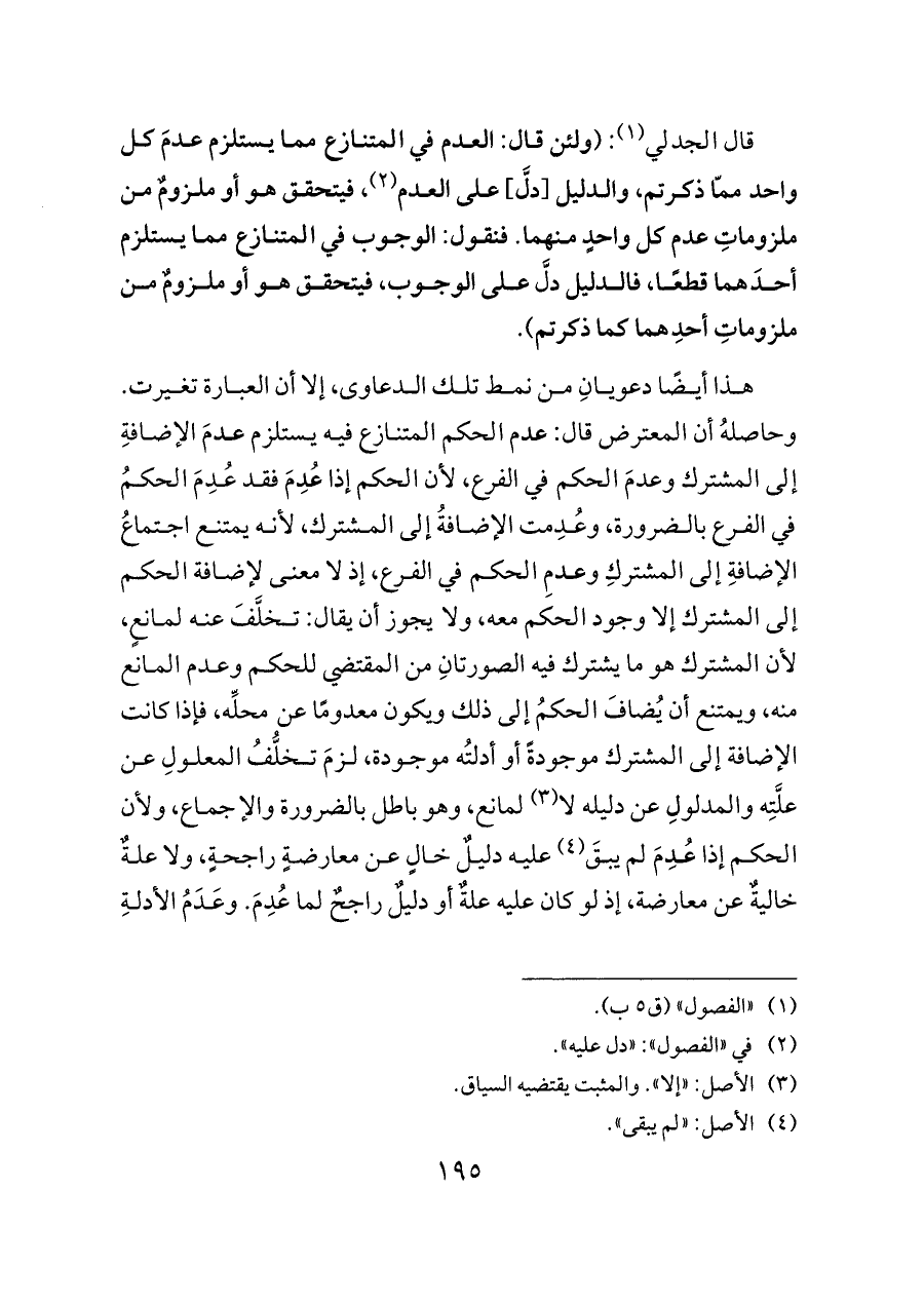 قال الجدلي (¬١): (ولئن قال: العدم في المتنازع مما يستلزم عدمَ كل واحد ممّا ذكرتم، والدليل [دلَّ] على العدم (¬٢)، فيتحقق هو أو ملزومٌ من ملزوماتِ عدم كل واحدٍ منهما. فنقول: الوجوب في المتنازع مما يستلزم أحدَهما قطعًا، فالدليل دلَّ على الوجوب، فيتحقق هو أو ملزومٌ من ملزوماتِ أحدِهما كما ذكرتم).
