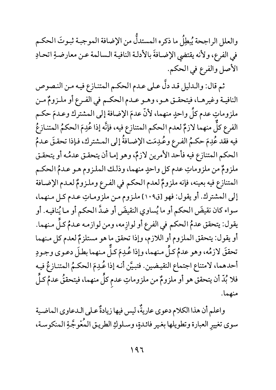 ثم قال: والدليل قد دلَّ على عدم الحكم المتنازع فيه من النصوص النافية وغيرها، فيتحقق هو، وهو عدم الحكم في الفرع أو ملزومٌ من ملزوماتِ عدم كلِّ واحدٍ منهما، لأنّ عدمَ الإضافة إلى المشترك وعدمَ حكم الفرع كلٌّ منهما لازمٌ لعدم الحكم المتنازع فيه، فإنَّه إذا عُدِمَ الحكمُ المتنازعُ فيه فقد عُدِمَ حكمُ الفرع وعُدِمَت الإضافةُ إلى المشترك، فإذا تحققَ عدمُ الحكم المتنازع فيه فأحد الأمرين لازمٌ، وهو إما أن يتحقق عدمُه أو يتحقق ملزومٌ من ملزوماتِ عدم كل واحدٍ منهما، وذلك الملزوم هو عدمُ الحكم المتنازع فيه بعينه، فإنه ملزومٌ لعدم الحكم في الفرع وملزومٌ لعدم الإضافة إلى المشترك. أو يقول: فهو [ق ١٠٩] ملزوم من ملزوماتِ عدم كل منهما، سواء كان نقيضَ الحكم أو ما يُساوي النقيضَ أو ضدَّ الحكم أو ما يُنافيه. أو يقول: يتحقق عدمُ الحكم في الفرع أو لوازِمه، ومن لوازمه عدمُ كلٍّ منهما. أو يقول: يتحقق الملزوم أو اللازم، وإذا تحقق ما هو مستلزمٌ لعدم كل منهما تحققَ لازمُه، وهو عدمُ كلٍّ منهما، وإذا عُدِمَ كلٌّ منهما بطلَ دعوى وجودِ أحدهما، لامتناع اجتماع النقيضين. فتبيَّن أنه إذا عُدِمَ الحكمُ المتنازعُ فيه فلا بُدّ أن يتحقق هو أو ملزومٌ من ملزوماتِ عدمِ كلٍّ منهما، فيتحققُ عدمُ كلٍّ منهما.