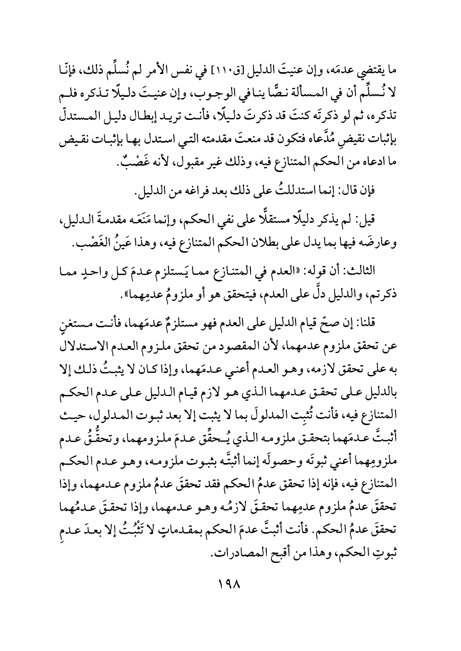 قلنا: إن صحّ قيام الدليل على العدم فهو مستلزمٌ عدمَهما، فأنت مستغنٍ عن تحقق ملزوم عدمهما، لأن المقصود من تحقق ملزوم العدم الاستدلال به على تحقق لازمه، وهو العدم أعني عدمَهما، وإذا كان لا يثبتُ ذلك إلا بالدليل على تحقق عدمهما الذي هو لازم قيام الدليل على عدم الحكم المتنازع فيه، فأنت تُثبِت المدلولَ بما لا يثبت إلا بعد ثبوت المدلول، حيث أثبتَّ عدمَهما بتحقق ملزومه الذي يُحقِّق عدمَ ملزومهما، وتحقُّقُ عدم ملزومِهما أعني ثبوتَه وحصولَه إنما أثبتَّه بثبوت ملزومه، وهو عدم الحكم المتنازع فيه، فإنه إذا تحقق عدمُ الحكم فقد تحققَ عدمُ ملزوم عدمهما، وإذا تحققَ عدمُ ملزوم عدمِهما تحققَ لازمُه وهو عدمهما، وإذا تحققَ عدمُهما تحققَ عدمُ الحكم. فأنت أثبتَّ عدمَ الحكم بمقدماتٍ لا تَثْبُتُ إلا بعدَ عدمِ ثبوتِ الحكم، وهذا من أقبح المصادرات.