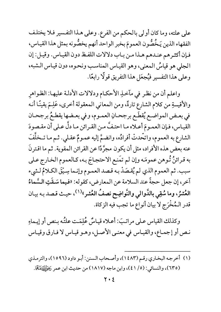 واعلم أن من نظر في مآخذِ الأحكام ودلالات الأدلة عليها: الظواهرِ والأقيسةِ من كلام الشارع تارةً، ومن المعاني المعقولة أخرى، عَلِمَ يقينًا أنه في بعض المواضع يُقطَع برجحانِ العموم، وفي بعضها يقطعُ برجحان القياس، فإن العمومَ أعلاه ما احتفَّ من القرائن ما دلَّ على أن مقصودَ الشارع به العموم، واتّحدتْ أفرادُه، وانضمَّ إليه عمومٌ عقلي. ثم ما تخلَّفَ عنه بعض هذه الأفراد، مثل أن يكون مجرَّدًا عن القرائن المقوية. ثم ما اقترنَ به قرائنُ تُوهن عمومَه وإن لم تَمنع الاحتجاجَ به، كالعموم الخارج على سبب. ثم العموم الذي لم يُقصَدْ به قصد العموم وإنما سِيْقَ الكلامُ لشيء آخر، إن جعل حجةً عند السلامة عن المعارض، كقوله: «فيما سَقَتِ السَّماءُ العُشرُ، وما سُقِي بالدَّوالي والنَّواضِح نصفُ العُشر» (¬١)، حيث قصد به بيان قدر المُخْرَج لا بيان أنواع ما تجب فيه الزكاة.