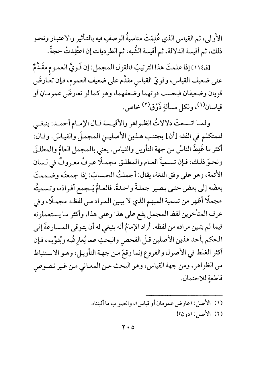 ولما اتسعتْ دلالاتُ الظواهر والأقيسة قال الإمام أحمد: ينبغي للمتكلم في الفقه [أن] يجتنب هذين الأصلينِ المجملَ والقياسَ. وقال: أكثر ما غَلِطَ الناسُ من جهة التأويل والقياس. يعني بالمجمل العامَّ والمطلقَ ونحوَ ذلك، فإن تسميةَ العام والمطلق مجملًا عرفٌ معروفٌ في لسان الأئمة، وهو على وفق اللغة، يقال: أجملتُ الحسابَ: إذا جمعتَه وضممتَ بعضَه إلى بعض حتى يصير جملةً واحدةً. فالعامُّ يَجمع أفرادَه، وتسميتُه مجملًا أظهر من تسمية المبهم الذي لا يبين المراد من لفظه مجملًا، وفي عرف المتأخرين لفظ المجمل يقع على هذا وعلى هذا، وأكثر ما يستعملونه فيما لم يتبين مراده من لفظه. أراد الإمامُ أنه ينبغي له أن يتوقى المسارعةَ إلى الحكم بأحد هذين الأصلين قبلَ الفحصِ والبحثِ عما يُعارِضُه ويُقوِّيه، فإن أكثر الغلط في الأصول والفروع إنما وقعَ من جهة التأويل، وهو الاستنباط من الظواهر، ومن جهة القياس، وهو البحث عن المعاني من غير نصوصٍ قاطعةٍ للاحتمال.