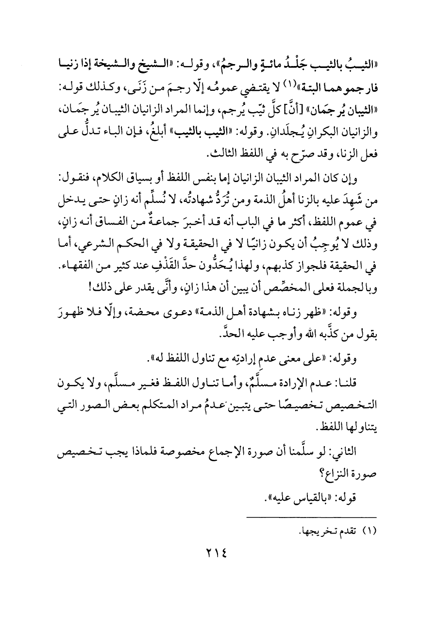وإن كان المراد الثيبان الزانيان إما بنفس اللفظ أو بسياق الكلام، فنقول: من شَهِدَ عليه بالزنا أهلُ الذمة ومن تُرَدُّ شهادتُه، لا نُسلِّم أنه زانٍ حتى يدخل في عموم اللفظ، أكثر ما في الباب أنه قد أخبرَ جماعةٌ من الفساق أنه زانٍ، وذلك لا يُوجِبُ أن يكون زانيًا لا في الحقيقة ولا في الحكم الشرعي، أما في الحقيقة فلجواز كذبهم، ولهذا يُحَدُّون حدَّ القَذْفِ عند كثير من الفقهاء. وبالجملة فعلى المخصِّص أن يبين أن هذا زانٍ، وأنَّى يقدر على ذلك!