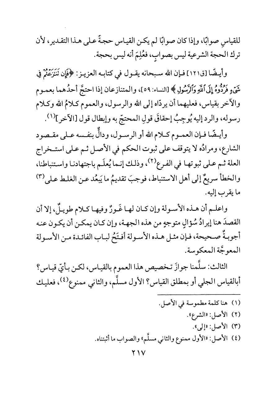 وأيضًا [ق ١٢١] فإن الله سبحانه يقول في كتابه العزيز: {فَإِنْ تَنَازَعْتُمْ فِي شَيْءٍ فَرُدُّوهُ إِلَى اللَّهِ وَالرَّسُولِ} [النساء: ٥٩]، والمتنازعان إذا احتجَّ أحدُهما بعموم والآخر بقياس، فعليهما أن يردّاه إلى الله والرسول، والعموم كلامُ الله وكلام رسوله، والرد إليه يُوجِبُ إحقاقَ قولِ المحتجّ به وإبطال قول [الآخر] (¬١).