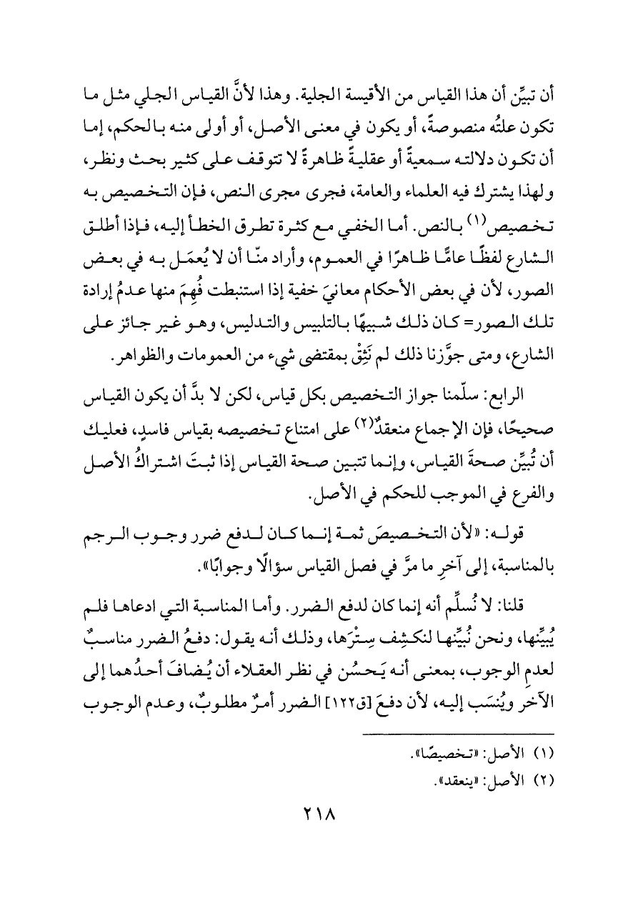 أن تبيِّن أن هذا القياس من الأقيسة الجلية. وهذا لأنَّ القياس الجلي مثل ما تكون علتُه منصوصةً، أو يكون في معنى الأصل، أو أولى منه بالحكم، إما أن تكون دلالته سمعيةً أو عقليةً ظاهرةً لا تتوقف على كثير بحث ونظر، ولهذا يشترك فيه العلماء والعامة، فجرى مجرى النص، فإن التخصيص به تخصيص (¬١) بالنص. أما الخفي مع كثرة تطرق الخطأ إليه، فإذا أطلق الشارع لفظًا عامًّا ظاهرًا في العموم، وأراد منّا أن لا يُعمَل به في بعض الصور، لأن في بعض الأحكام معانيَ خفية إذا استنبطت فُهِمَ منها عدمُ إرادة تلك الصور= كان ذلك شبيهًا بالتلبيس والتدليس، وهو غير جائز على الشارع، ومتى جوَّزنا ذلك لم نَثِقْ بمقتضى شيء من العمومات والظواهر.