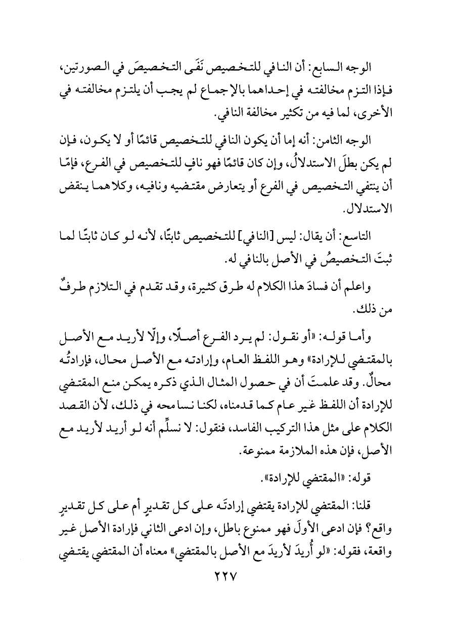قلنا: المقتضي للإرادة يقتضي إرادتَه على كل تقديرٍ أم على كل تقديرٍ واقع؟ فإن ادعى الأولَ فهو ممنوع باطل، وإن ادعى الثاني فإرادة الأصل غير واقعة، فقوله: «لو أُريدَ لأريدَ مع الأصل بالمقتضي» معناه أن المقتضي يقتضي