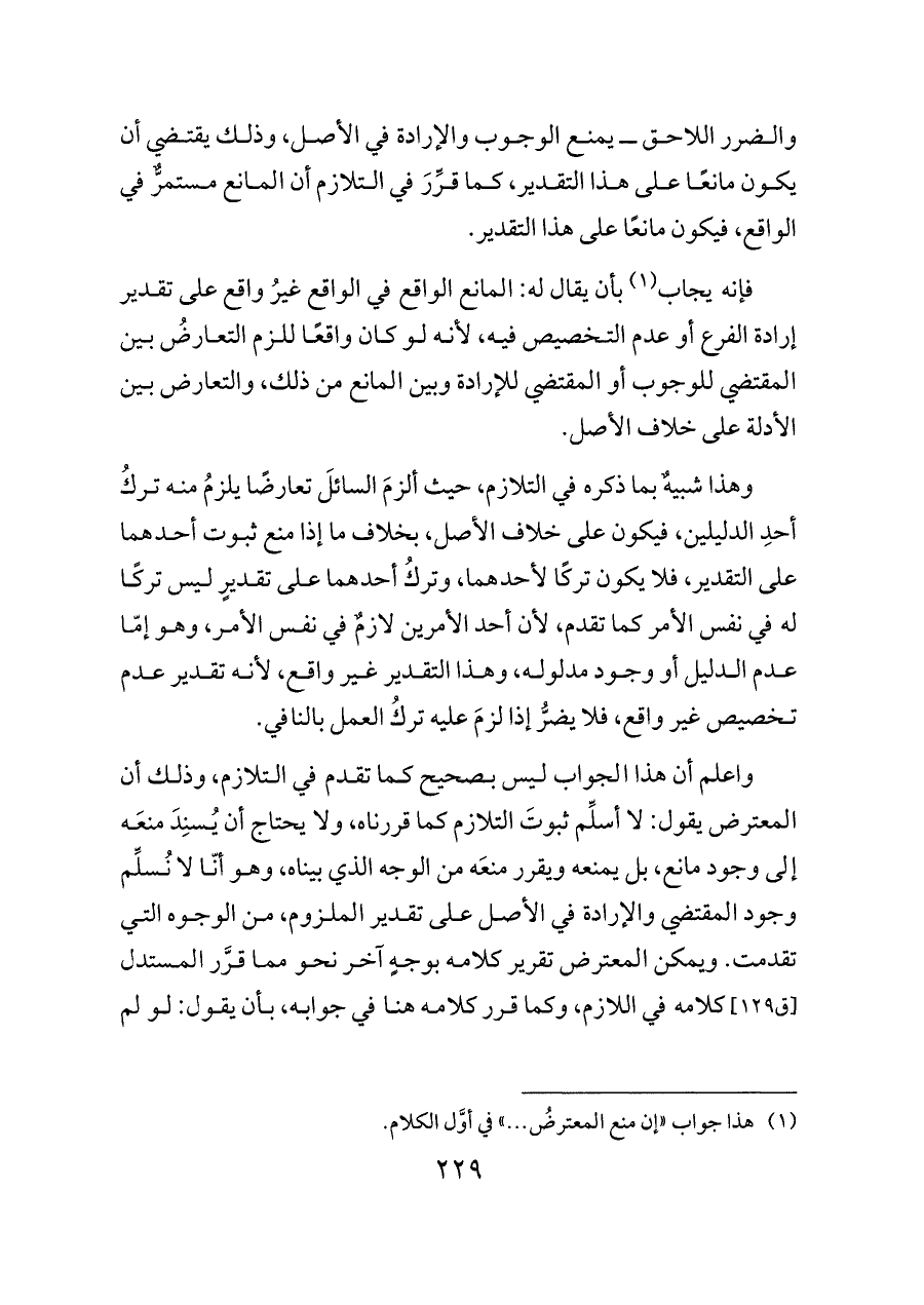 واعلم أن هذا الجواب ليس بصحيح كما تقدم في التلازم، وذلك أن المعترض يقول: لا أسلِّم ثبوتَ التلازم كما قررناه، ولا يحتاج أن يُسنِدَ منعَه إلى وجود مانع، بل يمنعه ويقرر منعَه من الوجه الذي بيناه، وهو أنّا لا نُسلِّم وجود المقتضي والإرادة في الأصل على تقدير الملزوم، من الوجوه التي تقدمت. ويمكن المعترض تقرير كلامه بوجهٍ آخر نحو مما قرَّر المستدل [ق ١٢٩] كلامه في اللازم، وكما قرر كلامه هنا في جوابه، بأن يقول: لو لم