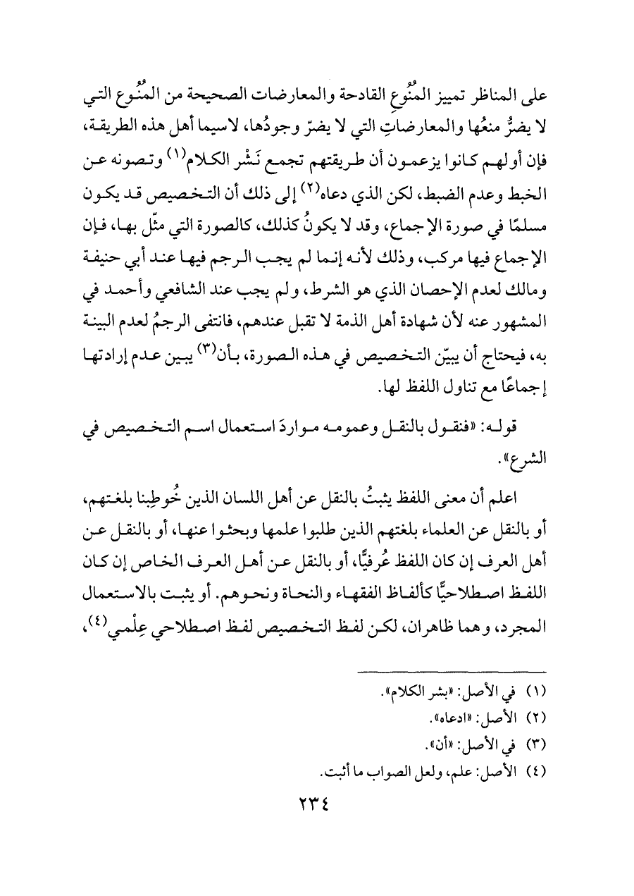 اعلم أن معنى اللفظ يثبتُ بالنقل عن أهل اللسان الذين خُوطِبنا بلغتهم، أو بالنقل عن العلماء بلغتهم الذين طلبوا علمها وبحثوا عنها، أو بالنقل عن أهل العرف إن كان اللفظ عُرفيًّا، أو بالنقل عن أهل العرف الخاص إن كان اللفظ اصطلاحيًّا كألفاظ الفقهاء والنحاة ونحوهم. أو يثبت بالاستعمال المجرد، وهما ظاهران، لكن لفظ التخصيص لفظ اصطلاحي عِلْمي (¬٤)،