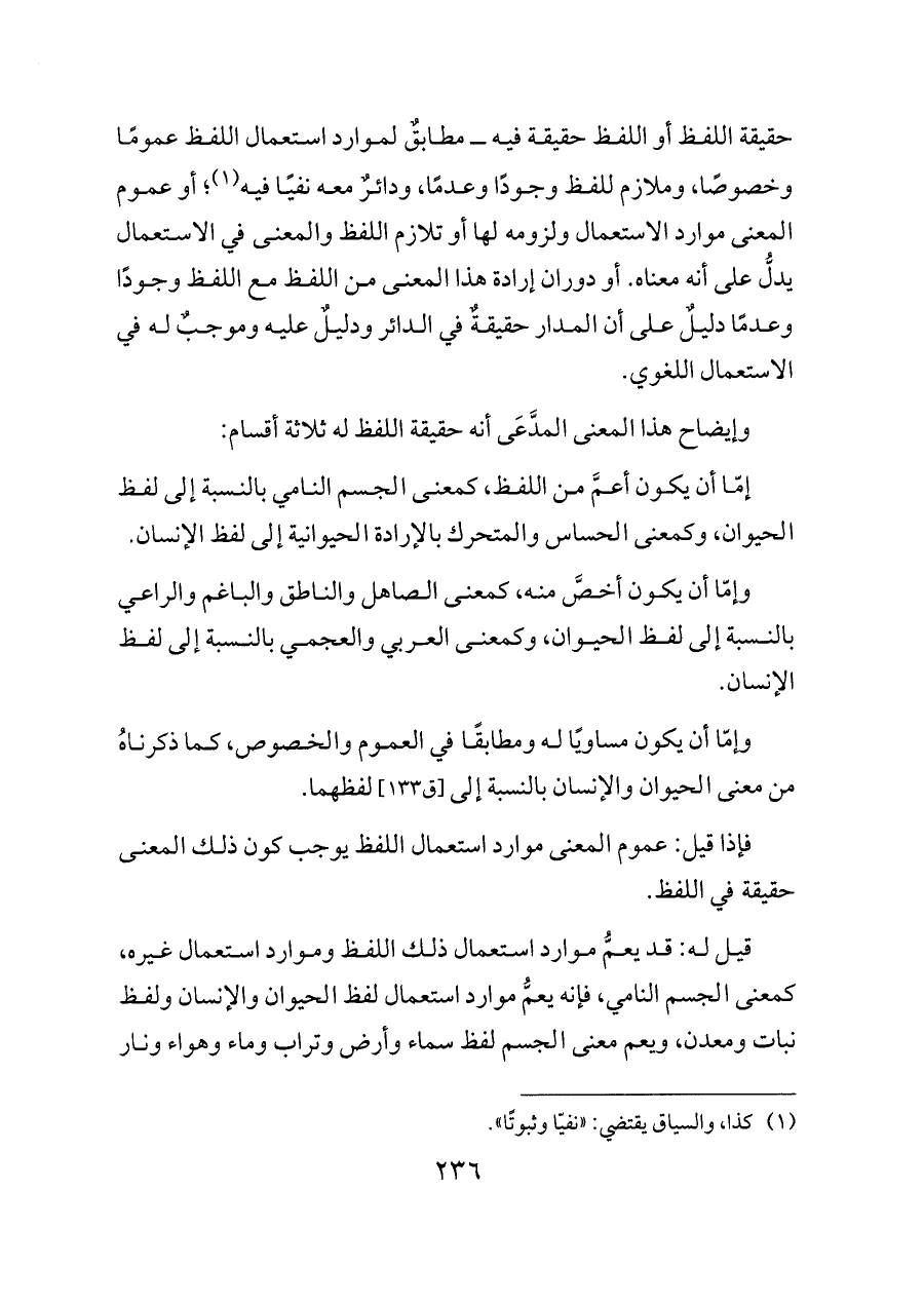 وإمّا أن يكون مساويًا له ومطابقًا في العموم والخصوص، كما ذكرناهُ من معنى الحيوان والإنسان بالنسبة إلى [ق ١٣٣] لفظهما.